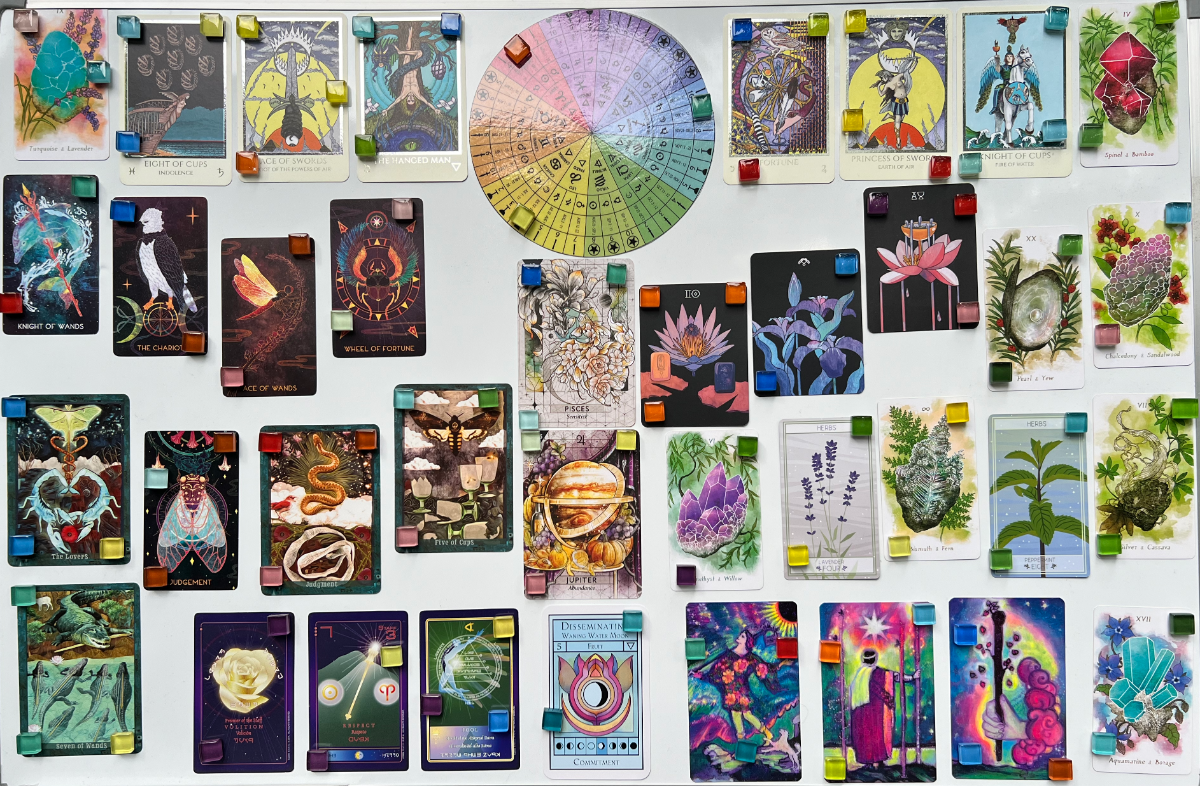 Existing cards will be exchanged with new incoming cards as the wheel of the year turns. Lunar phases change every 3 - 4 days; decans change every 10 days. Months change every 28 - 31 days. Note: I am working with 2 different systems to mark the months, one solar and the other lunar. I shall try to post a new board every time there is significant movement.