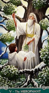 2. V The Hierophant: I adhere strongly to well established traditional pathways of Tarot play. My centeredness and purity of spirit allows me to be a channel for Divine information. The world is full of abundance and magic. I live to teach and to guide. I shine a bright, clear light. My vision is unsullied and sure. I am reliable and trustworthy. I am here for a higher purpose.