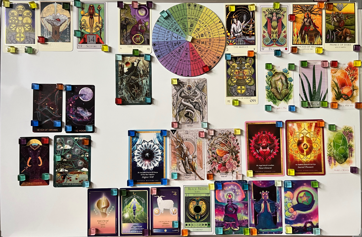 Existing cards will be exchanged with new incoming cards as the wheel of time turns. Lunar phases change every 3 - 4 days; decans change every 10 days. Months change every 28 - 31 days. Note: I am working with 2 different systems to mark the months, one solar and the other lunar. I shall try to post a new board every time there is significant movement.
