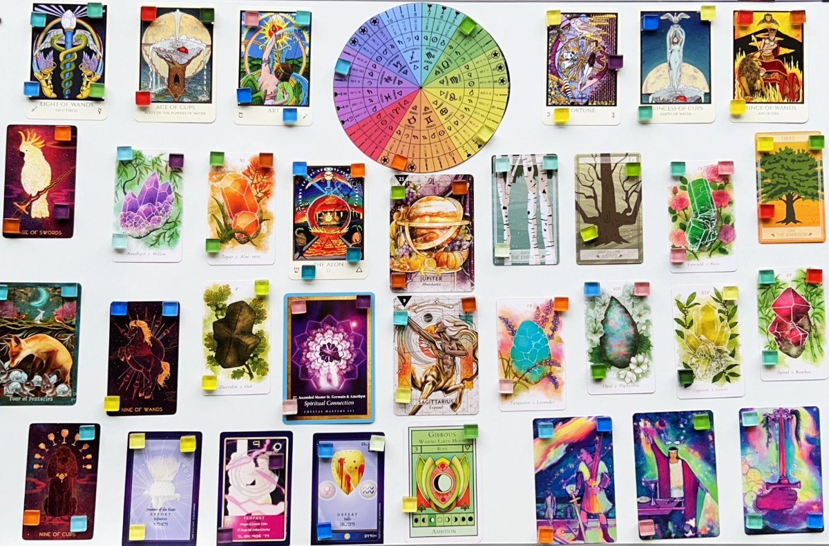 The middle cards are animal, crystal, and plant correspondences according to T. Susan Chang in the book ‘Tarot Correspondences’. These are tied to the Major Arcana cards as they appear in Tarot Netivot representing each Jewish month, Jewish holidays, and major lunar and solar events as well as to the Western Hermetic Major Arcana in the top rows. These are taken from various decks in my collection. New additions: Horse; and Dog; Amethyst; Lime; Oak; and Birch — all correspondences associated with XIV Temperance.