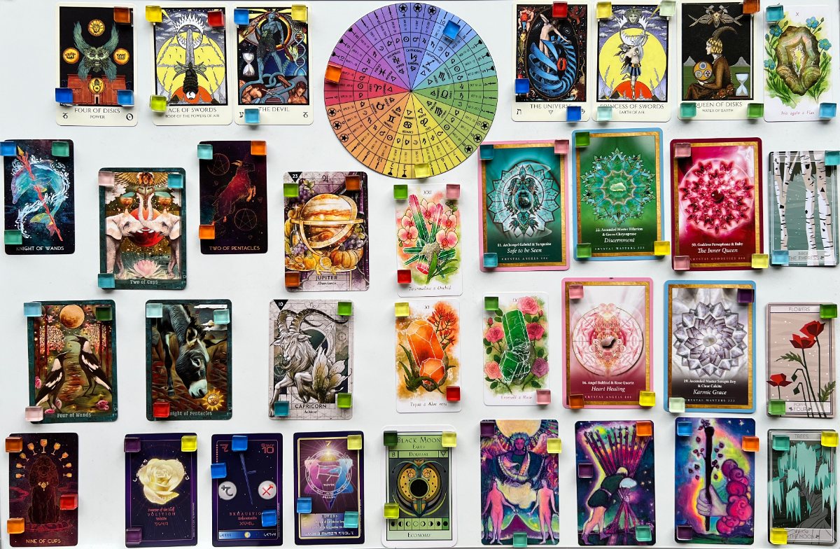Existing cards will be exchanged with new incoming cards as the wheel of time turns. Lunar phases change every 3 - 4 days; decans change every 10 days. Months change every 28 - 31 days. Note: I am working with 2 different systems to mark the months, one solar and the other lunar. I shall try to post a new board every time there is significant movement.