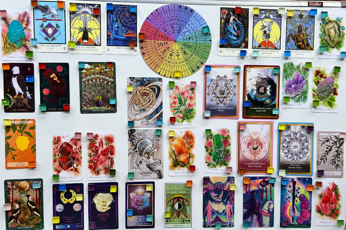 The middle cards are animal, crystal, and plant correspondences according to T. Susan Chang in the book ‘Tarot Correspondences’. These are tied to the Major Arcana cards as they appear in Tarot Netivot representing each Jewish month, Jewish holidays, and major lunar and solar events as well as to the Western Hermetic Major Arcana in the top rows. These are taken from various decks in my collection. New additions: Otter, Eagle, Peacock, Turquoise, Chalcedony, Amethyst, Garnet, Quartz, Jasper, Fruit Trees (Lemon, Cherry, and Pomegranate), Olive, and Fir. All are correspondences for the month of Aquarius.