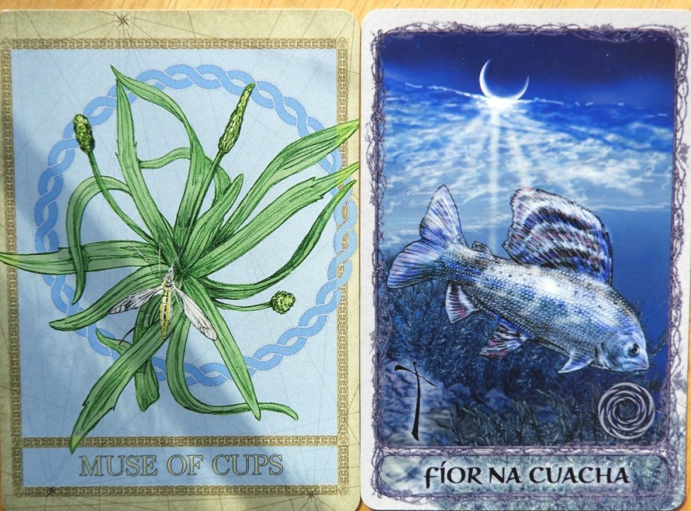 Today I want to compare the Anieth deck's Muse of Cups - Prince of Cups with the same card from the Stone Tarot's Fior Na Cuacha - Muse of Cups or - here in the deck : Summer, blue, think, figure out, form How different they are! and just as an asside: the LWBs of both decks are identical in text = meanings for the cards. But neither one of these 2 are to me speaking much about anything to do with sex- as the booklet says The poor lonely Fish! Where is his/ her mate? Now the big question I haveis this: Ifffff I had pulled the Fior Na Cuacha instead of the Anieth deck's Muse of Cups as my card of the day a few days ago, would it have also led me to the same conclusion about inflammation and the need of an anti-inflammatory? Well, hindsight is always 20/20 and yes, maybe I would have gotten a different card to point me towards the solution, but for argument's sake, let me see: The Fior Na Cuacha is all blue - for me not a colour of summer, but of truth - deep dark blue = deep er laying truth of the matter Moon - Intuition rays of moon light illuminating the large fish = pointing to a fishy problematic situation deep beneath everyday reality. The Fish is swimming above a tripple circle...... Well, this one thing would have put my nose into a completely different direction - A no less important one, bur far removed from the helpful advise I opened up to, when seeing the Anieth Muse of Cups. What is it? Well: I am leading an indigenous spirituality circle in my house. We are investigating deeper truth and meanings of largely lost indigenous teachings and the next circle is centred around WaterSpirits. The Fish and the circle would have led me into remembering to get stuff ready for our gathering..... which of course is true.
