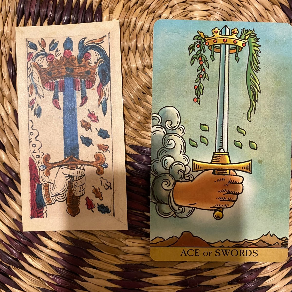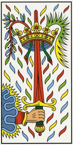 Hah! You made me pull out Ace Swords and look very closely. I've been reading for years and never thought about those trailing plants. For comparsin here's an older Tarocchi Ace swords from Dotti deck 1860s. Pretty ambiguous--but it is 2 different plants. In RWS I can see the olives and palm now that you mention it. Black olives can have a sort of dark red-purple-ish color on the tree. But then why not just make them a darker red? Is it simply an accident of print colors? Hmm. - Yesterday