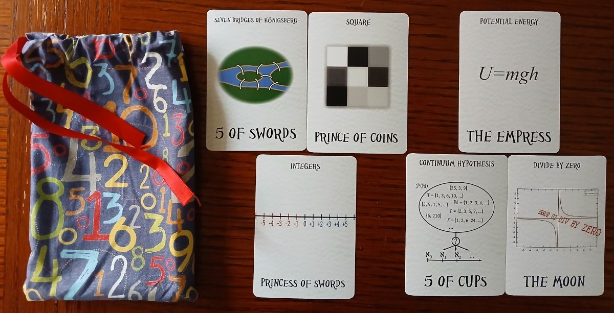 Hi, crew! Thank you as usual, @fire cat pickles! This week will be The Mathematics Tarot by Karen West, Anchorite Studios. I got it way back in the day. My copy is number 22 of 50. It has extra majors: The Empty Set, Möbius, and The Mathematician. And look at the absolutely adorable bag! I’m definitely in way over my head here, so I’m glad I have the pdf book. It looks like there is some overlap with physics concepts. (I also have the Tarot of Physics, but there’s no book for that! When I finally get around to using that one as a deck of the week, that close out my “Science Club” category.) I’ll probably be doing very small spreads or one card readings as I learn about math. But in the meantime, a regular interview. Wish me luck! What is your most important characteristic? Princess of Swords, Integers Math may seem complicated, but it’s all just numbers we learned as children and we use to count every day. What is your strength? Prince of Coins, Square Same idea. A square is so simple, yet the theory behind it is kind of amazing. Practical and useful. Your weakness? 5 of Swords, Seven Bridges of Konigsberg According to the book, it’s impossible to cross each bridge only once. The complexity and plurality of the concepts might make the deck seem unusable. What can I learn from you? The Moon, Divide by Zero Seems like an appropriate question for sure! And the first major. Dividing by zero is always an error and can cause problems, from frustration to catastrophe. I can learn there are some things that just can’t be done, no matter how simple they seem. How can I learn it? 5 of Cups, Continuum Hypothesis Another 5! I can’t even explain the hypothesis from the book, but something about there are an infinite number of sets of infinite numbers. It is listed as an unsolved problem, and one that is unproveable. I can learn about impossible things by feeling in my heart that some things are impossible! What will be the outcome of our work together? The Empress, Potential Energy Looks like a physics concept. This is the equation for gravitational potential energy. Everything that exists has potential energy. We will work together to bring out the meanings of the deck, which were only potential when it was just hanging out in my collection desk. Well, I think I did ok, except for the 5 of Cups (appropriate because it’s about frustration . . .).
