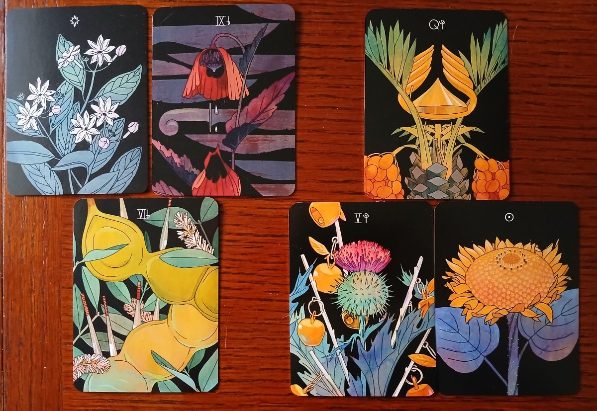 Hi, @fire cat pickles! Thanks as always! This week for me will be Botanica: A Tarot Deck About the Language of Flowers. I seem to keep getting flower-themed decks and not being satisfied. But I think this might be the keeper. I was attracted to the black backgrounds. It has glyphs for the card titles. And lovely black and gilded backs. Interestingly, the pips, and the crowns for the courts, are all different and are artifacts that relate to the meanings. For example, the wands in V Wands “are based on the Silver Rod of Manannan mac Lir, a Celtic hero god of the sea.” Obviously, I’ll be using the booklet a lot. So that should be interesting to explore, along with the plants/flowers, of course. Interview time! What is your most important characteristic? VI Swords, snuff box sea beans, Masai swords Seeds of the tree float from east Africa all the way to Asia and Australia. The deck is very clever and covers a lot of plants and parts of the world. What is your strength? IX Swords, poppies, Greek swords used for sacrifices The deck covers negative cards well. And is calming. Your weakness? Star, jasmine It can be intoxicating, calling attention to its beauty, taking away from its good ideas and attributions. What can you teach me? Sun, sunflower The deck can teach me all about everything good, warm, and open. How can I learn it? V Wands, thistle, silver rod of Manannan mac Lir The wands look like silver wands with gold apples attached. I shouldn’t worry if learning the deck is a bit of a struggle. It will be worth it for the sunny outcome. What will be the outcome of our work together? Q Wands, huluppu tree, crown of Inanna Inanna is the goddess who puts the hero Gilgamesh to work clearing her trees of demons. I will feel strong enough to use this unconventional deck. Sun and Star in the first reading (and the card I used as an example)? Sounds good to me! -