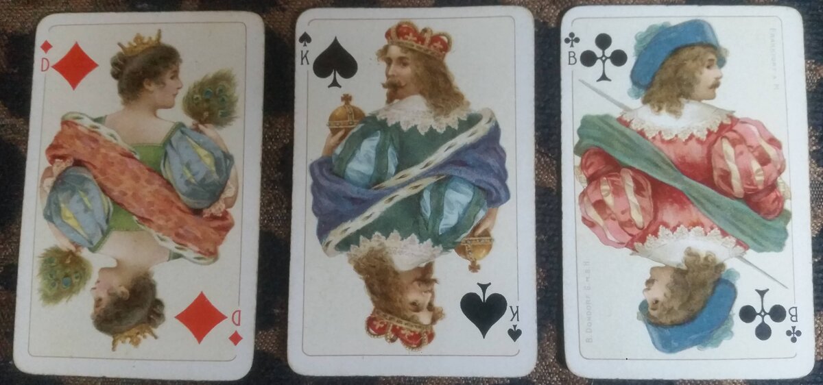 53rdspirit Posted August 11, 2020 Posted August 11, 2020 I recently purchased on old Dondorf Whist deck because of the charming fancy characters of the Courts and particularly the odd looking-over-the-shoulder look of the Queen of Diamonds, King of Spades and Knave of Clubs. I am familiar with directions in reading cards, left, right, full-on, half-face, full face, up, down, one-eyed, past, present, future, and even the Mitelli tarocchi deck with the Knights on Horses facing the four compass directions (I've always found the hind-end of a horse in that deck amusing 😄 ) , but this is something different for me --this over-the-shoulder glance. Is it interpreted as one being cautious, dishonest, sneaky, becoming caught, or surprised? Perhaps their name was called or they are being interrupted? I thought I'd present this here to read the observances of others as to what an over-the-shoulder look, appearing to be directly at the reader, not another card, could represent.
