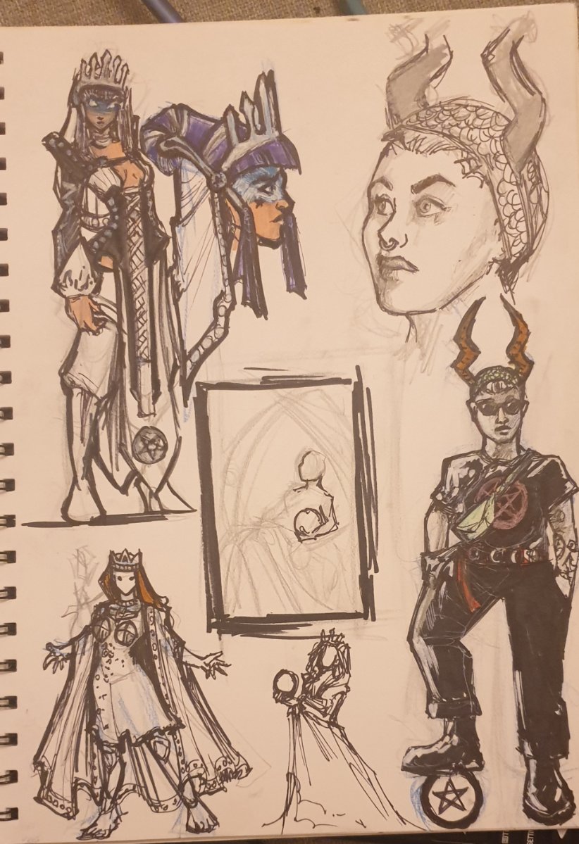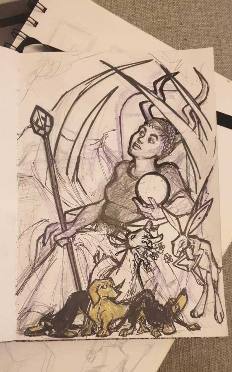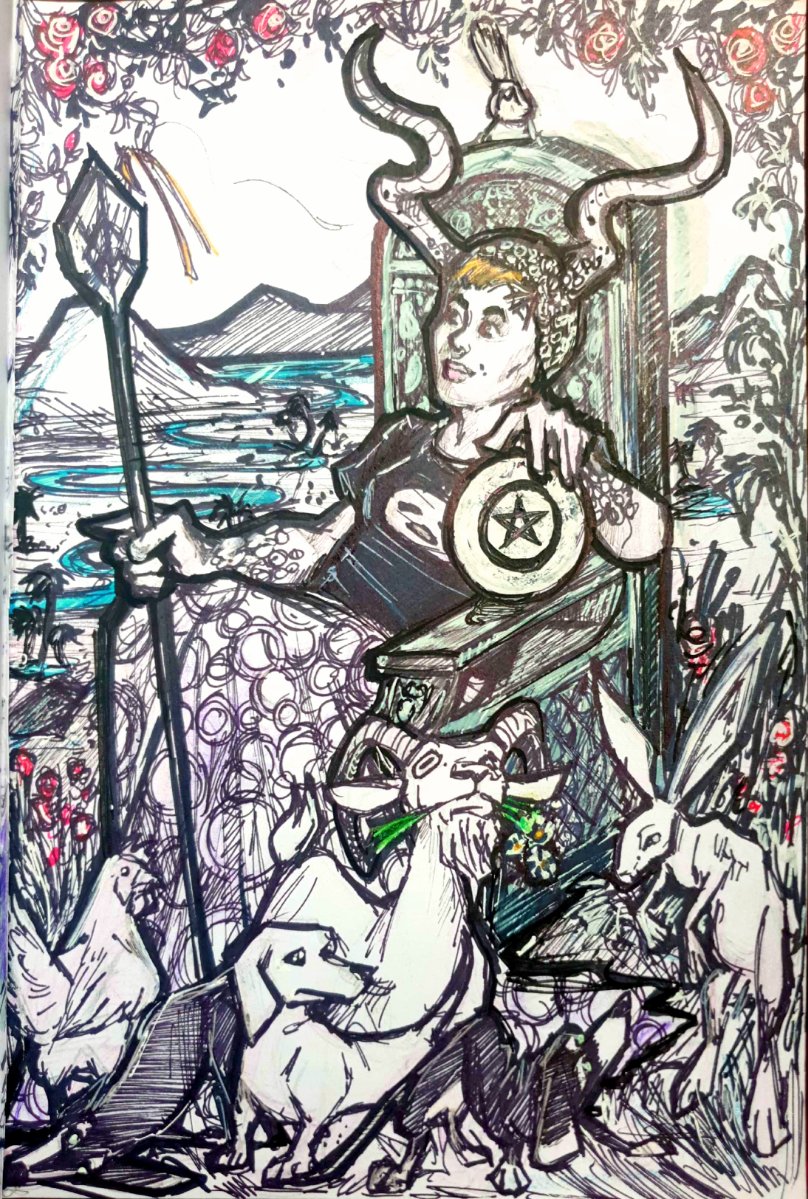GalllowsInk Posted November 17, 2020 Author Posted November 17, 2020 51 minutes ago, vulprix said: Love seeing more of your work, @GalllowsInk!!! 🤩 The Star figure’s pose in particular is inspired, but I really like everything you’re doing! I am intrigued by all of the animals you have on the Queen of Disks card! More than usual—though I do get that each of them can be well associated with her in some way. I would be down to hear the process in your choosing to give her multiple companions 😁 Thanks! I guess it just fit well enough into the whole Nurturing Aspect that I didnt really question it....I wanted her portray her as a mother, but without children of her own, And to have a court, because she is a Queen, But not necessarily portray wealth, And to Echo the Harvest and fertility... ...So More "rural" animals, as opposed to Lions or Stallions etc... portrayed as a family unit..ie. her children....The Goat and Hare are already part of the original cards...the Daschunds... are meant to be a like...version of Queen Elizabeths Corgis? But more German, because theres hints of the brother Grimm all over this card... The Bird on the top of the throne just seemed appropriate? Its a Fairy Wren, or maybe a Bearded Tit. Colourful, but tiny... And meant to evoke a kinda "disney princess" vibe . The Hen is to drill home the "mother/fertility" aspect...and to fill the frame at the lower left... And the Cockroach perched on top of her Staff , which is tiny, is there to give her something on her line of sight...to look adoringly upon...(Actually there a LITTLE more too it , but for brevities sake lets just go with "They fit" ...) Sooo...I guess... She's supposed to be rich, but not fancy, so She is dressed more "casually" than the other Queens (Tshirt and A comfy skirt)...but she still has a throne and a fancy crown and a garden of roses etc in a very arid region (desert vista below them) ....And a Court, made of animal's rather than subjects. Shes a protector and a nurturer, with a benevolent air about her, despite the devil horns. Also shes meant to be a Mirror of the Empress, who also has a bunch of animals on her card (sparrow, pigeon, Pelican (with babies) and fish ....the fish on the card Ive drawn arent very noticeable unless I point them out but theyre there....Ill make them a bit more proninent when I rework it into a full illustration)