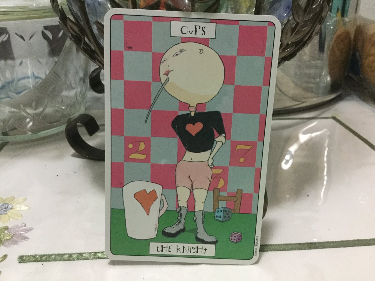 Cora Posted August 19, 2020 Posted August 19, 2020 (edited) First Impression This chick looks like a punk or a rebel. Not dictating her life to society norms and following her passion. She steps on anyone who will put her down. She’s thinks before she makes any move and she is well in tune to feelings. Now seeing the pink and muted blue softens her demeanor. It’s shows that she does has a soft spot and she is easy to love. Perhaps a soft teddy inside. Her black shirt with a pink heart makes me think she wear her heart on her sleeves. She has one long sword mustache that reminds me of wise man and she has no hair. She proudly displays her hand free. She may be sensitive, but it does not neglect her intelligence. She is on top of the table and a chair behind her. She is great in take charges, but still not in a position to be a leader. The cup is a bit in front of her and has a red heart. For some reason I image a cup of coffee. Coffee first before anything else. Lastly, I see the numbers 2, 3, and 7. One even and two odds. I can view that as chances. Not really sure about the numbers. In short, it’s a pretty card and you can get a lot of meaning with it. Welcome Howie, the Knight of Cups, to the table. Howie is impulsive, yet sensitive. When he feels his emotional needs calling he follows them, knowing that to ignore them will leave him feeling unfulfilled. After the LWB Howie has to be gender fluid. And they are intuitive. This card is a friendly LGBTQA card. 🥰 Edited August 19, 2020 by Cora