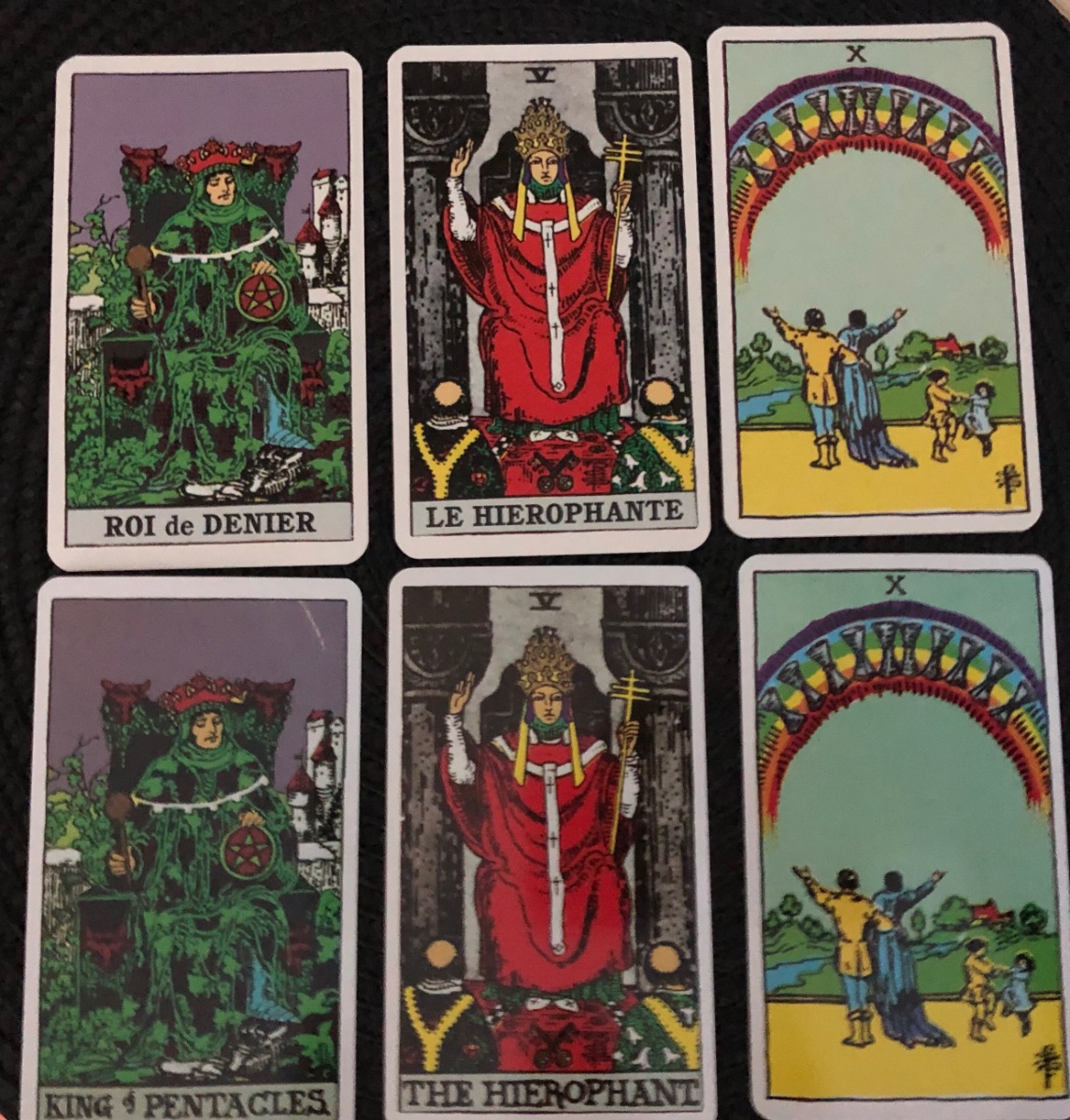 Guest Posted November 17, 2020 Posted November 17, 2020 Hi Much to my own surprise I like the Hanson-Roberts. I own the Belgian version. It is not without its flaws: the colours are far more muted than the first edition printed by AGMuller. Some of the cards can appear off centre but I would not say out of focus. When US Games started printing in Italy, there were batches of the Hanson-Roberts Tarot that had Belgian boxes (orange window box) but Italian cards (as seen on the dedication card). You cannot identify these without removing the shrink wrapping. These were decks were poor: the card stock was slippery, some colours were effected and the cards smelt and some looked pixelated. However, some of these appear to have been rectified. I’ve seen latter printing in the new boxes and these are not as bad. There is a Chinese printing of the deck (mini) that is closer to the Swiss version. I used this when I couldn’t shuffle well due to flare-ups. I’ve attached my Belgian and the Chinese Mini. I’ve also attached the Carta Mundi Albano (Belgian) and Italian. The Italian here sounds like your Hanson. It may be you got one of the Belgian boxes but Italian decks.