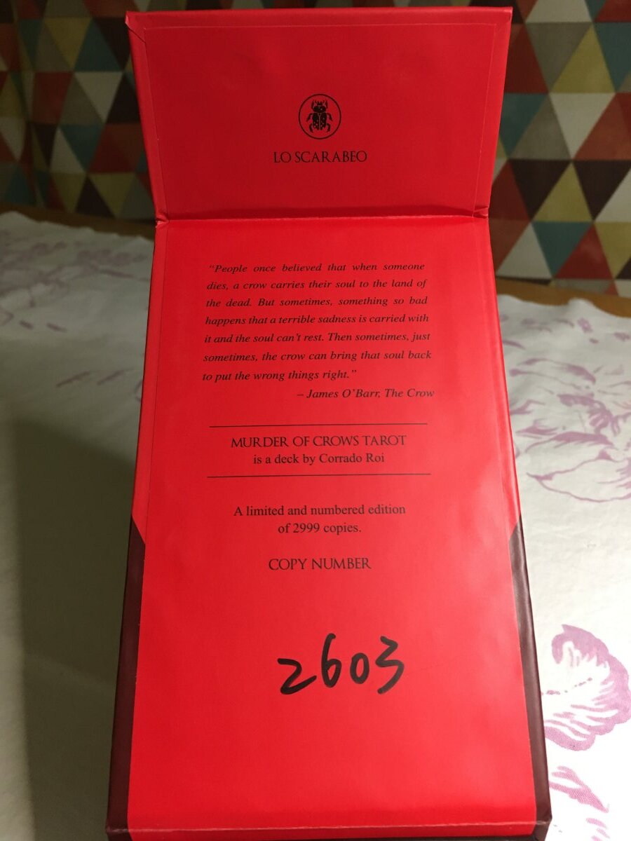 Madame Squee Posted November 29, 2020 Posted November 29, 2020 Thank you for the thread, VG!🎄 Computer woes are the worst!😖 I'm so glad you're up to the challenge!!! 🏆 I'm in with Murder of Crows Tarot, L.E. I got along so well with the standard deck that I had to try the limited edition! The main difference between the two are blood red highlights, larger cards, and numbered box. The standard deck has a title card, but the L.E. doesn't. However, the L.E. has two significator cards, both of which are double-sided: (1) The Crow Mother/The Crow Father; (2) The Crow of Dusk/The Crow of Dawn. The LWB text appears to be the same in both editions, except for an addition regarding the significator cards. I cannot find a publication date in the standard LWB, but the L.E. is dated October 2020. The card stock appears identical in both decks: glossy, high quality, flexible. Both stacks measure 1.75 in. Murder of Crows Tarot is a dramatic deck for sure. The Limited Edition turns it up several notches, which I really like. And I appreciate the larger details in it. But I'll never stop loving the standard edition, already a comfortable friend. PS: The standard edition may have had an ad card with it, too. But if so, I've misplaced mine. No worries. It'll turn up if it was there.😬