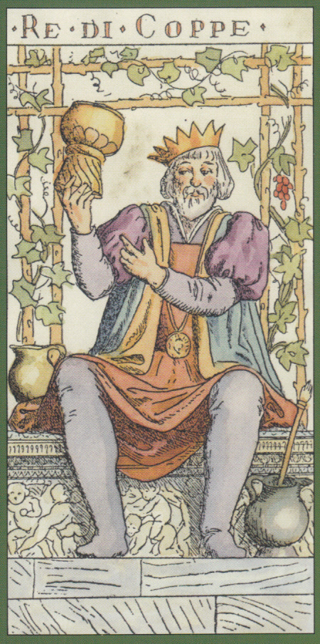 Bodhiseed Posted March 7, 2021 Posted March 7, 2021 This week I'll be using the Tarot of the Master, created by Giovanni Vacchetta and published by Lo Scarabeo. Along with it, I'll be drawing from the Paracelsus Oracle, published by Lo Scarabeo with instructions written by Gina di Roberto. The cards drawn for today are the King of Chalices and Fortuna Minor: This King of Chalices, with his tilted crown, looks like he's had quite a few cups of cheer. The booklet describes him as a 'vine grower' or cultivator of grapes for wine. From his celebratory mood, it looks like he's had a good year. But I'm guessing he's the kind of person that always sees the glass as half full. Cups are vessels made for holding; we can choose to put anything in them, from sludge to sparkling cider. Fortuna Minor (lesser fortune) suggests success brought about by change. Perhaps what we worked for didn't pan out, but that doesn't mean we don't have other things to be cheerful about. A gallon of sweet tea with 1/4 a teaspoon of salt added to it will likely still be delicious, but only if our mind can let go of that quarter teaspoon and enjoy the rest. Though we may not always be able to control what gets dumped in our cups, we can choose to make our hearts any size we want. With such a vast heart, immense as the wide-open sea, suffering cannot overpower us, just as a small handful of salt cannot make a great river salty. ~ Thich Nhat Hanh