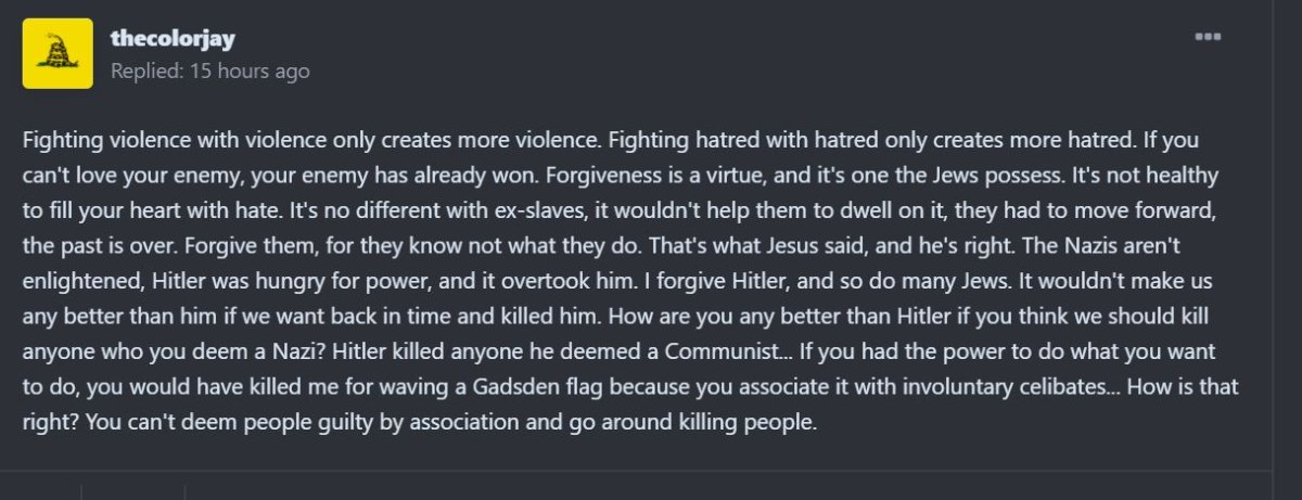thecolorjay Posted March 11, 2021 Author Posted March 11, 2021 3 minutes ago, katrinka said: What you're neglecting to mention here is that YOU were PM'ing me, trying to push your agenda, looking for converts. I never invited you to PM to begin with. You asked me to, and when I didn't, you started flooding my PM box. And no, I wasn't having it, and since you don't seem to comprehend "no", I eventually told you to f*** off which is an appropriate response to someone who is telling me to have compassion for poor widdle misunderstood nazis (and this AFTER I stated that historically only one thing works against nazis and we did it in WWII): I am not interested in playing nice with nazis. And the only reason I haven't blocked you is that I feel the need to keep an eye on you. No, she isn't. That flag was political in 1775 and it's even more political now, having been adopted by nazis, tea partiers, etc.https://en.wikipedia.org/wiki/Gadsden_flag I think you can change your privacy settings not to allow everyone to private message you. This is a public forum, and I was responding to your comment. I was not looking to convert you to anything, least of all Nazism as I am not a Nazi and that's a judgement that you're making. If non-aggression (which is what I'm advocating) is Nazism, well I guess you're right. But that's not what Nazism is. You could have politely asked me to stop private messaging you, but instead you resorted to derogatory language. You also lumped in Trump supporters with Nazis, and I think that's incredibly dangerous, especially since you were advocating mass murder of anyone you deem as such. You're obviously a very angry person, and I'm sorry you're filled with such hatred.