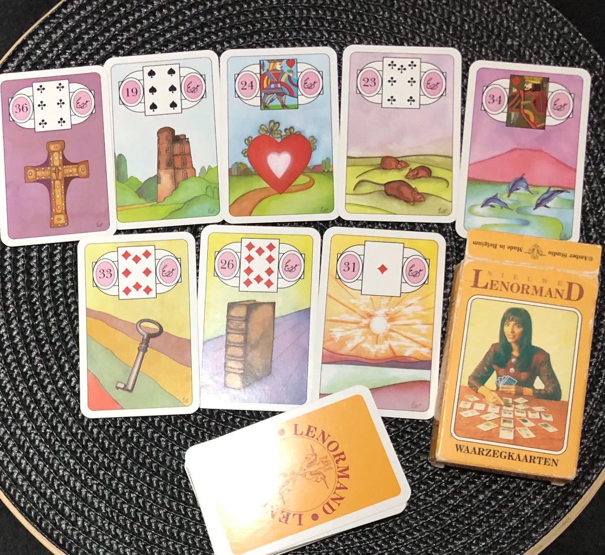 Guest Posted March 24, 2021 Posted March 24, 2021 (edited) 34 minutes ago, katrinka said: Ah, Erna's! I remember frantically searching for all things Erna back when I started - alas, her english book was OOP and the deck must not have been available, even then. I did correspond with a lady in Belgium who took Erma's course and actually met with her. She shared a lot of it, but as I recall, it wasn't All That. Not casting aspersions on Erna, just saying that I can see how the deck might be somewhat wonky. 😉 Going on memory, the English translation went out of print c. 2003*. The French is also out of print. For some reason, the German translation has been reissued twice. Obviously, the Dutch is still available. Erna Droesbeke does divide opinion. I cannot comment on her latter stuff which I am told is more “innovative.” Purely judged on the Oracle of Mlle Lenormand, her meanings were close enough to what I had learned. I primarily focused on the spreads (3 x 3 and the past, present and future full-board). *In 1987, Erna published the Kaartleggen met Mlle Lenormand. It was illustrated with the Brepols. Outside of German that was the first full-length work on the Petit Lenormand. In 1989, translations were issued in French, German and English. It came in a horrible plastic box (like a VHS) and included the book and a set of Blaue Eule cards that were used to illustrate the translation. Edited to add: These are my cards. They are copyright 1992. They came with a fold out LWB. I cannot read Dutch but they are clearly from her 1987 text. It has the Method of the Cross and Cross of Destiny (PPF full-board). Edited March 24, 2021 by Guest Add Pics: