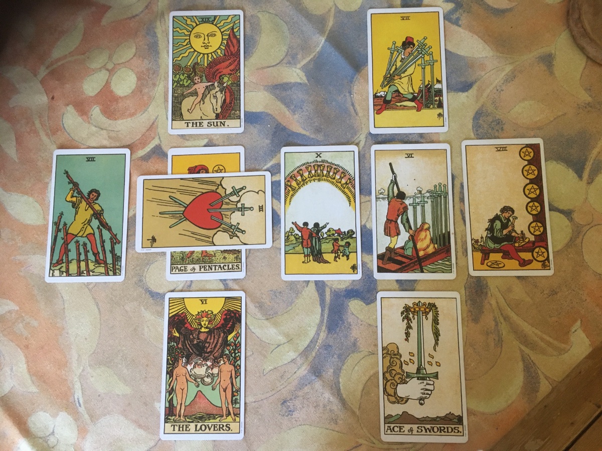 Seren Posted June 17, 2021 Posted June 17, 2021 I recently decorated my bedroom (on a very small budget!!) and purchased some fabric remnants on eBay for the soft furnishings. I had a scrap left over. I always do a monthly 10 card reading for myself and post the pic up as my computer wallpaper for the duration. I just use to lay the cards out on my boring old table top, but now I use the left over fabric remnant as the background and it's really brightened up my computer screen! Here's the pic of my June reading ....