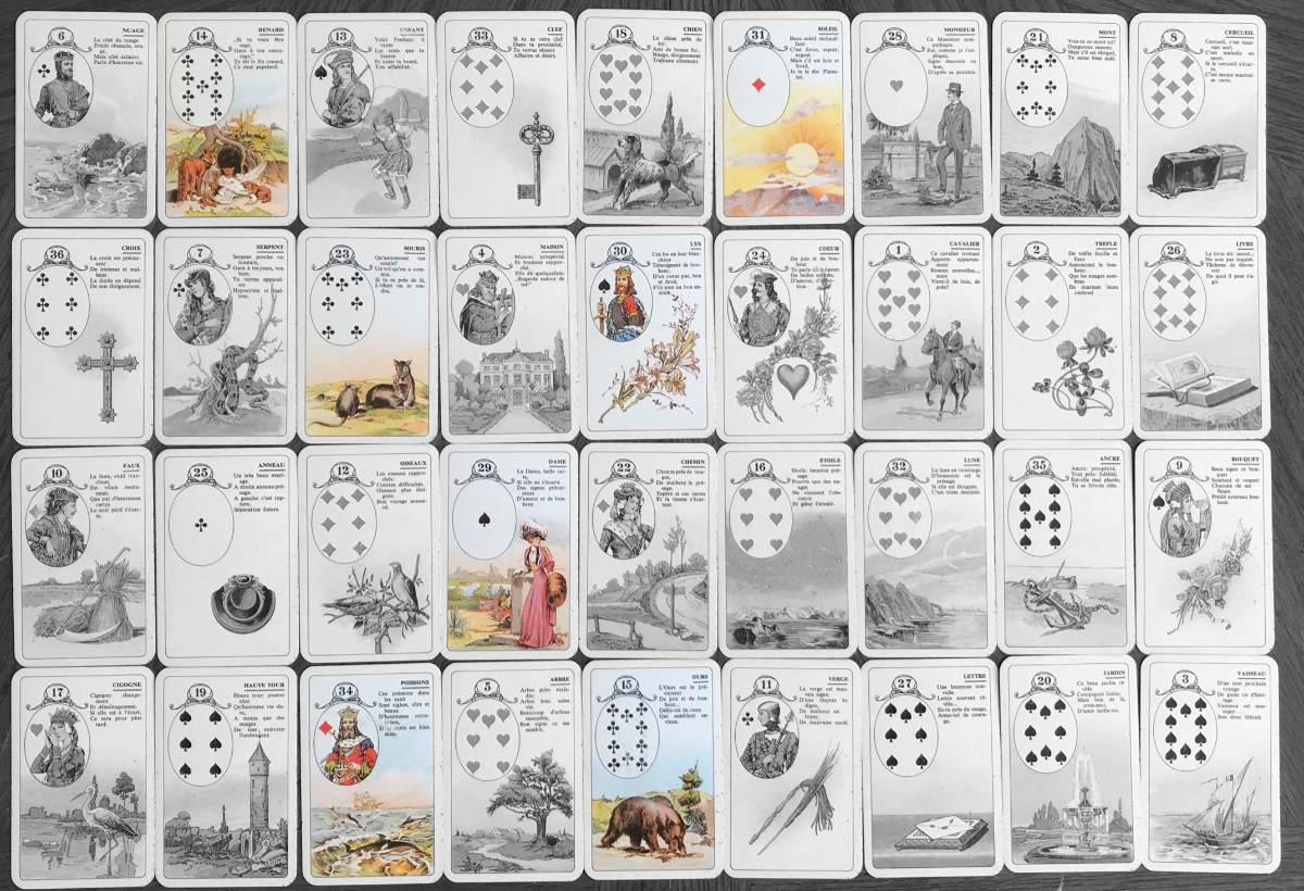 Guest Posted March 25, 2021 Posted March 25, 2021 (edited) The Full Board or Grand Tableau For the quadrant method, Erna Droesbeke utilised the 9 x 4 (four rows of nine). In the fourth GT she combined part of the four quadrants with the near/far method. Here is a full-board I did earlier today for a woman (Ace♠) using the method as I wanted to have a proper example. I apologise for my rather worn out cards, they are well-used. Edited March 26, 2021 by Guest