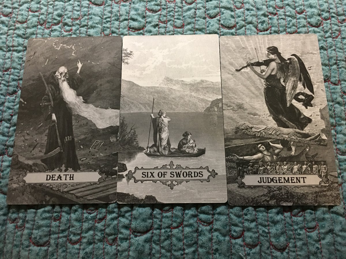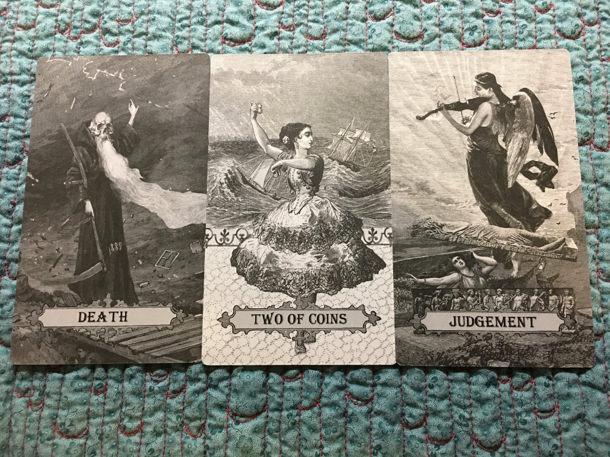Madame Squee Posted March 28, 2021 Posted March 28, 2021 It's 9:30pm. I'm drinking coffee and turning over Lua Tarot cards. I see that everything is scattered to the winds in Death. And it's time to face the music in Judgement. The Eight of Cups seems the ideal card for the central position, especially considering its theme of pilgrimage. But I soon realize that Death and Judgement provide perfect bookends for many other cards, too. The Two of Coins appears to have weathered the storm and is dancing to the music. The Six of Swords is escaping towards sweet music. I think I might spend more time this week looking for great bookends in a line of three.