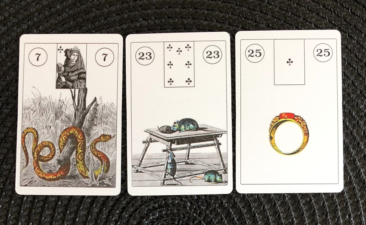 Guest Posted April 24, 2021 Posted April 24, 2021 7 minutes ago, fabfranco said: @timtoldrum Thank you profoundly for the very ellucidating lesson. I hadn't paid attention that, in those two situations, direction play a role. Therefore, I reckon that if the snake head is towards the left, the cards positions (and their meanings) have to reverse, right? Yes. However there is an issue: it would mean that the B card is eating the A. It is for this reason one prefers right facing Fox and Serpent card. Madame Al-Ansari (my second teacher) favoured the Rote and Blaue Owl cards. 16 minutes ago, fabfranco said: And, if you allow me, how could I interpret those pairs using attendance? I understood the mechanics of proximity here, but I wasn't able to - right away - say what the compounded pair Mice + Snake could mean (what came to my mind, straight away, was "complicated loss" or "betraying theft"). Likewise, when looking at the pair Snake + Stork, the sentence which came to my mind was "changing treachery" or "relocation wranglings"... In the GT the line went Gentleman - Birds - Serpent - Mice - Ring. Ring is the house of the Moon. He was extremely worried (Gentleman + Birds) about losing a relationship (Serpent + Mice + Ring). However the lost can be avoid (Serpent eats the Mice) through the agency of a woman (Birds + Serpent). The Serpent was over (influence) the Cavalier who had backed off as the Gentleman was in the midst of a divorce from his wife. I will be writing up the GT for a post. But for privacy, he will vet the reading so I cannot go into too much details.