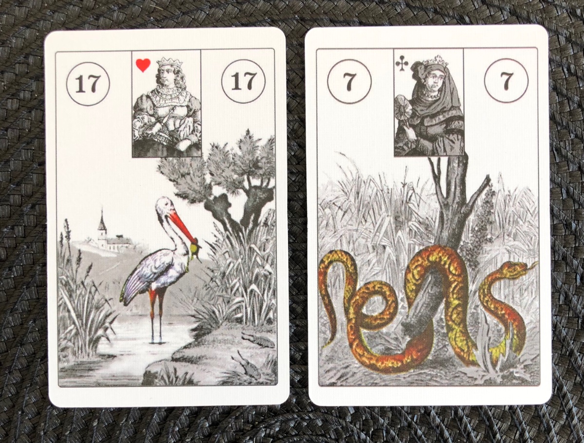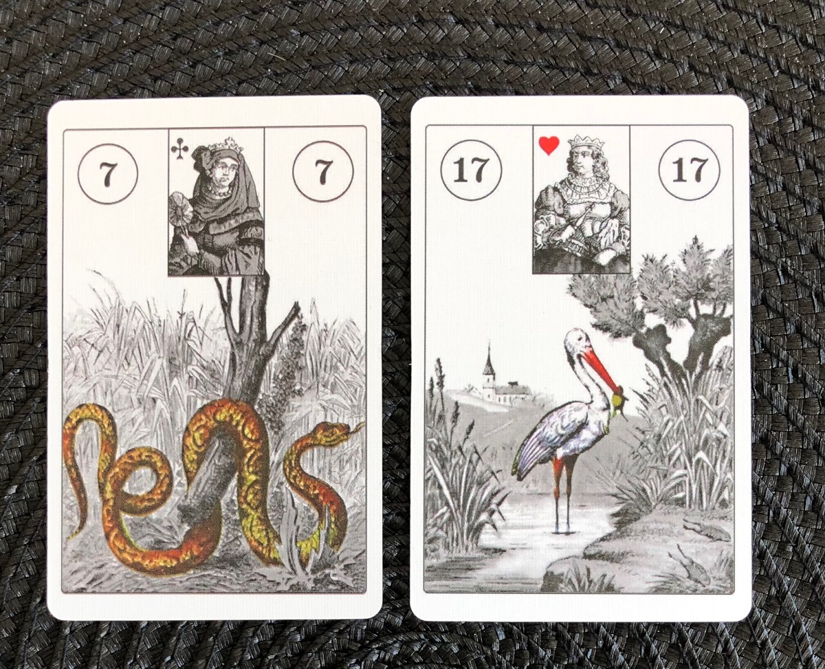 Guest Posted April 24, 2021 Posted April 24, 2021 16 minutes ago, fabfranco said: By the way @timtoldrum et al: is it true that the Snake neutralizes the Mice and the Stork neutralizes the Snake? I read it somewhere, but I hadn't seen it in any book that I have. Yes. The Serpent and the Mice was the subject of the first article I ever wrote (2010). My second teacher — a French cartomante — told me the rule (she had a few including the Serpent biting the Fox’s heel). I did a GT on Thursday where the Gentleman’s line ended: The Serpent neutralises the Mice. Ring is safe. Like all snakes, she will need time to digest her meal. Had he got the above the Mice are left to run riot. The Ring is unsafe. The Stork and the Serpent is much the same. Björn was fond of it. Its origin is old. If you look at old Petit Lenormands (and the Das Spiel der Hoffnung), the Stork is wading and is eating either a frog or near. It is a reference to the Frog King. However, storks, herons and cranes all eat snakes. Above the Stork neutralises the Serpent. But below is the reverse: Here the venom of the Serpent overcomes the Stork.