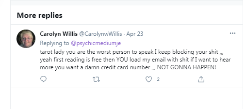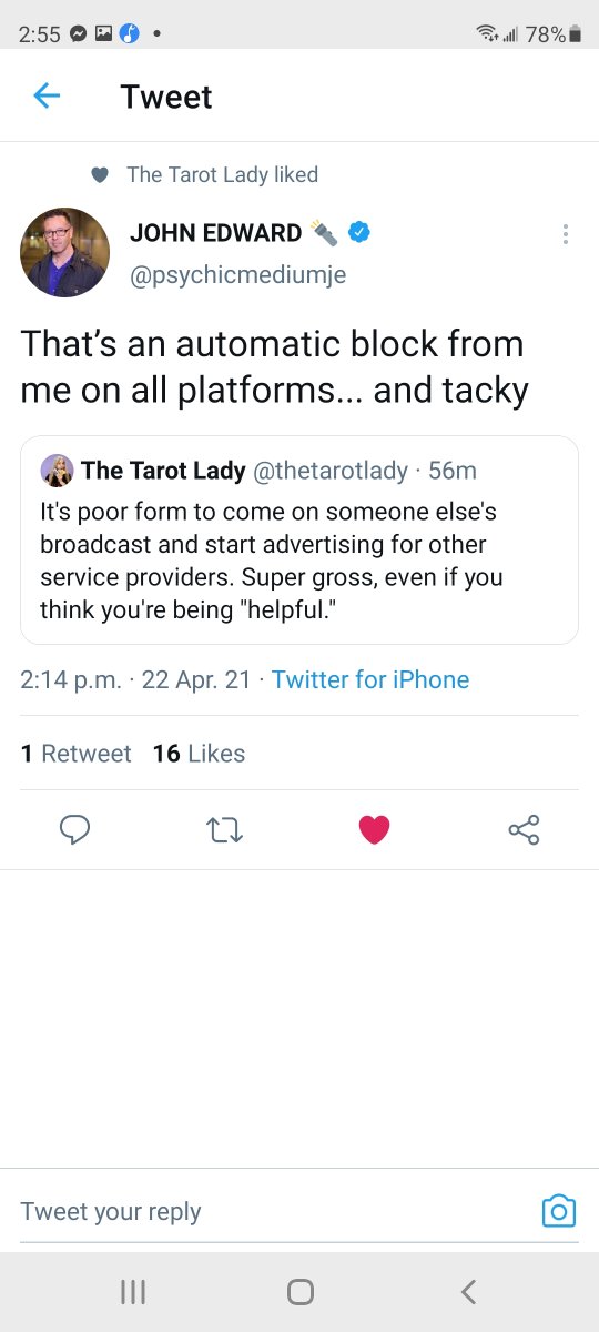HOLMES Posted April 25, 2021 Posted April 25, 2021 (edited) I don't know which livestream it was, i looked at the time but no clue where It was tweeted 3 days ago. What caught my eye at first was john edwards support. So i read the tarot lady tweet and she shares she was blocked. I was not sure what to title this post. But i think it is important. In the past on psychic reading site, i saw couple of times a person would just go into advertising spiel instead of geniunely trying to help the person. Edited April 25, 2021 by HOLMES
