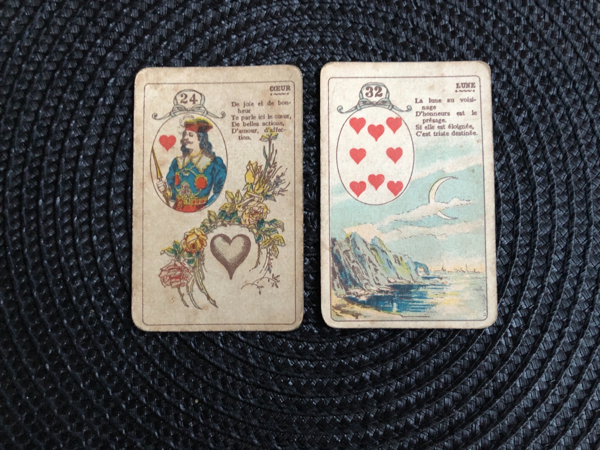 Guest Posted May 6, 2021 Posted May 6, 2021 In looking at the Brepols (Jeu Lenormand CM), there remain two "What is that?" mysteries considering the Jack of Hearts and the Moon card. In the Moon card: The "blank" space behind the mountains; scans from worn-out cards perhaps? The Jack of Hearts: What does he hold in his hand? Also: Does anyone know who exactly designed the deck around 1920? (Brepols Publishing, single artist? Groupwork?) Kind regards