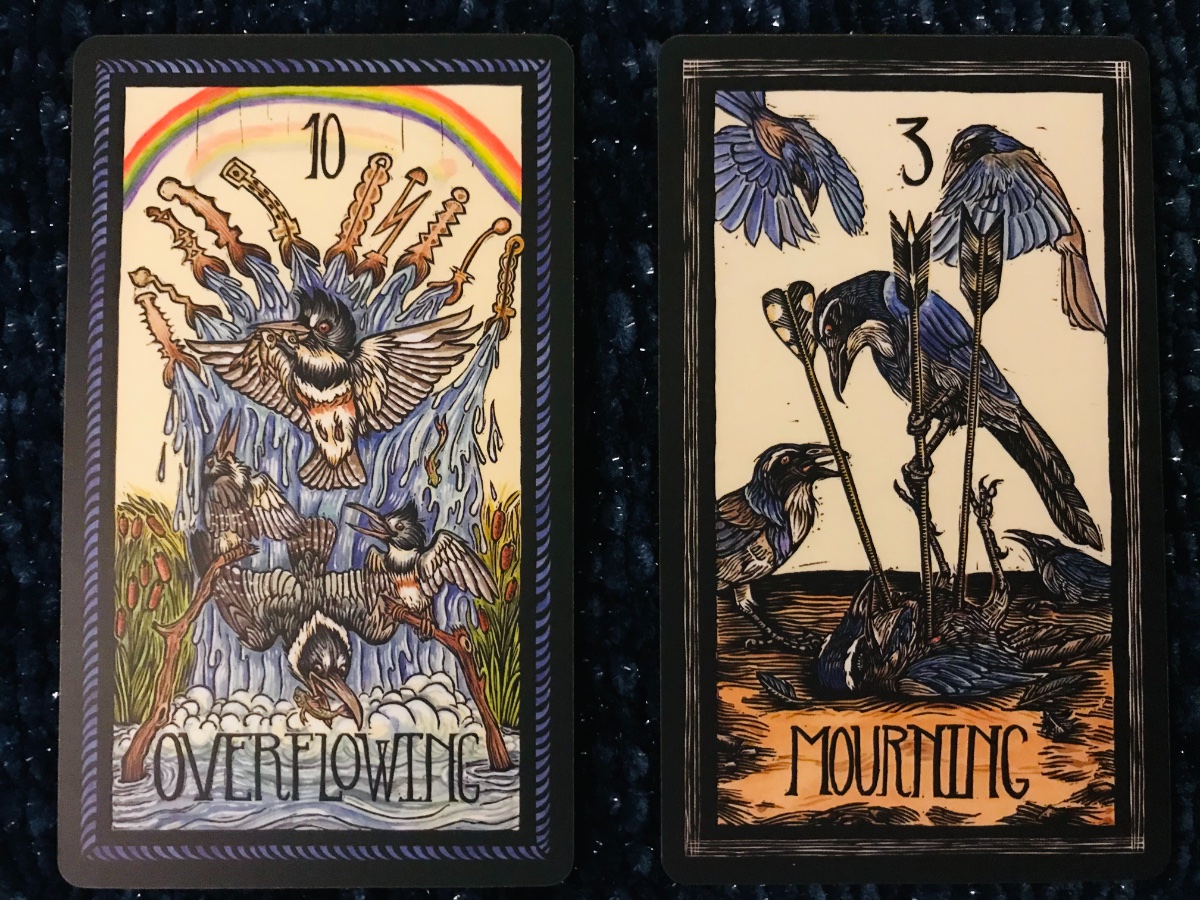 vulprix Posted June 13, 2021 Posted June 13, 2021 The Brady Tarot is still hitting hard. I haven’t felt so connected to a deck in a very long time. Today, my draw is 10 of Horns (Cups)—Overflowing, and 3 of Arrows (Swords)—Mourning. Today was an overflowing day indeed, and I visited my sister and her family—always absolutely overflowing with energy. I usually find myself exhausted after being with them, but they always have so much love for each other and are so full of joy and life. What I love about Rachel Pollack’s guidebook for this deck is that she emphasizes the miracle of nourishment and connection. Where does it spring from? It’s just there. Bask in it. This helps me feel a bit alive, even if exhausted—in a good way 🙂 Whereas the 3 of Swords really is my internal world, mourning. Couldn’t have said it better. I was with my partner for almost a decade. That’s over now and the “new normal” is very surreal. I find myself having to soak in the reality of it to try and make sure that everything makes sense. And other birds, others in my life, are fluttering around, bearing a bit of witness. What is so interesting about these two cards in particular can be seen in the picture I took of them today. Yes, the cards both depict (different species of) blue birds, but the color choice is so nuanced in each. The shades, the tones in the 3 of Arrows give the card a whole different color and vibe from the buoyant and fantastic 10 of Horns.