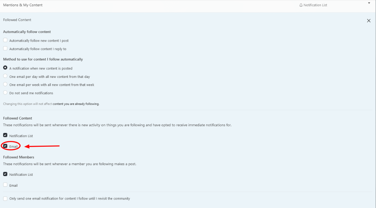 there is a setting for automatically following new threads and also how often you want notifications but the important one is Followed Content.