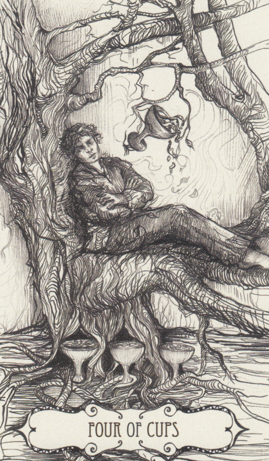 Bodhiseed Posted August 1, 2021 Posted August 1, 2021 This week I'll be using the Tarot of the Abyss, created by Ana Tourian and published by U.S. Games. Paired with it will be the Lantern Oracle, created by Angelina Mirabito, illustrated by Yuly Alejo, and published through Blue Angel. Today's draws are the Four of Cups and Creative Power: Art enables us to find ourselves and lose ourselves at the same time. – Thomas Merton This young man napping in the branches of a tree seems exhausted. A vacation with others, the end of a big project, or the day after a celebration can leave anyone feeling worn out in body and spirit. A bit of solitude for restoration might work wonders, but what if the apathy persists? The Creative Power card suggests this has to do with generating ideas and producing them creatively. Every artist or craftsperson has probably experienced a block that seems to keep them in neutral gear. Focusing on how bone dry we are won't help us make any progress. Pablo Picasso stated, "Inspiration exists, but it has to find you working." I'd probably change 'working' to 'playing.' Whatever creative work we do, can we try doing it just for fun, not to make something that fits our judgment of 'good'? Or perhaps we could try another form altogether - writing, sewing, painting, woodworking, etc. - just for the heck of it. When we lose ourselves in play, we might just find the thread to our creative power dangling right in front of us.