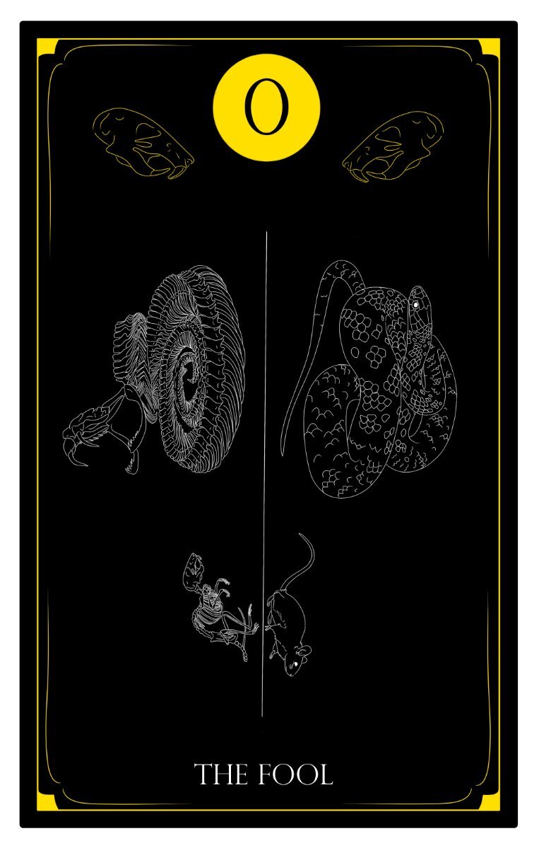 sawasta Posted September 4, 2021 Posted September 4, 2021 I've been working on my own deck, the Black Silk Tarot (I'm an artist and I've felt a burning need to make my own deck ever since I started with tarot, it just feels like the best way to have a deck that actually resonates with me) I would love any feedback that you guys have to offer! Especially since I'm sure a lot of you have more experience with tarot and indie decks in general. I am open to suggestions and revision ideas. I have about 14 cards, a box design, and a card back design but I'll just start off with my first card and the card back design for right now. for each card I decided to use symbolism I personally feel drawn to (the overall style is more representative of my identity as an artist, and a lot of the deck is symbolic or metaphorical in nature) for the card back design, I mostly went with a design that fit the aesthetic style of the deck, I'm very drawn to plants and nature in general and for me personally plants are a big part of my sense of spirituality. This deck has a lot of emphasis on nature and the beauty of the natural world, it also has an emphasis on minimalistic design. for the fool card, I used the mouse to represent the fool. On the right, the mouse is passing close by to a snake, showing the naivety and idea of beginners luck associated with this card. Since this card is also associated with new beginnings, but more specifically the idea of a leap of faith, the mouse is clearly escaping and the snake appears passive. In this situation, the fool is embodying the positive nature of this card in that it is showing the way that idealism and taking chances can work out in ones favor. On the left, there is the warning aspect of this card, showing the dangers of recklessness, etc, through the snake being ready to strike. The negative message of this card is conveyed as skeletons because it is a warning, telling you what you might have to face or may currently be dealing with in terms of the nature of your situation. While this card is positive when upright in that it can show that it is the time to make that leap of faith, I feel the emphasis on this card is always a gentle warning to be aware of risks and the reality of your situation. When upright, the mouse has escaped, yes, but still had to pass a snake (aka, you have to dive into your situation, whether positive and upright or reversed and unwelcome). I would like to note that on the left, the snake has not caught the mouse, the mouse is alert and facing the snake as well. This is because this is still not an overall negative card, though my personal leaning is to emphasize the cautionary tale of the fool. If anyone took the time to read this, thank you! again I appreciate any feedback or criticism 🙂