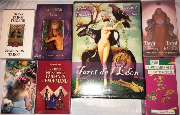 sandrang123 Posted August 20, 2018 Posted August 20, 2018 I wanted to follow up on this purchase, but we've been traveling and have also had house guests. You might remember I got this lot of 7 decks on EBAY. They were all sealed and new. I was super excited about the Gipsy Tarot, and *sort of* like it in person, as I do the Tarot des Femmes deck. Not love at first handling, but interesting energies. LOVE the Lenormand--might be my new favorite Lenormand deck in hand. But I'm most enthralled by the Tarot de l'Eden so wanted to post pics of some of the cards from this beautiful deck. The Tower here is called "The House of God" and Death is called "The Card with No Name." Really gorgeous images, with a full book to accompany it. Unfortunately, it is all in French, and though I did study French for a few years, I'm having to use Google Translate a lot! The Cartes D'Harmonisation par les Fleurs and Dream Cue Cards are going up on EBAY. Just didn't take to them. All in all, though: Good deal!