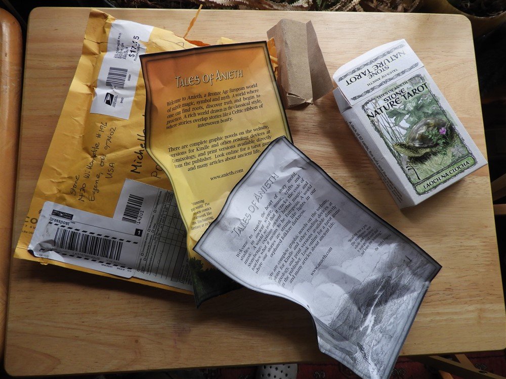 Mi-Shell Posted July 11, 2019 Posted July 11, 2019 (edited) Well, my Anieth Stone Tarot arrived. I am rather dismayed at its general condition! It was packed in a simple padded envelope and the box, the cards were in is pretty smushed. the box also, when straightened out as far as that still works, does not really fit the deck, it is s weeee bit too short and quite a bit too wide.....?? A.E. Stone stuffed a piece of cardboard into the gap, But that has now crumpled up and messed up several cards. 2 pamphlets, that came with it are crumpled. I have not looked at all the cards yet, will do that tomorrow. All in all I think I can be glad, the deck got here at all, since my name and address had 3 mistakes in it! Edited July 11, 2019 by Mi-Shell