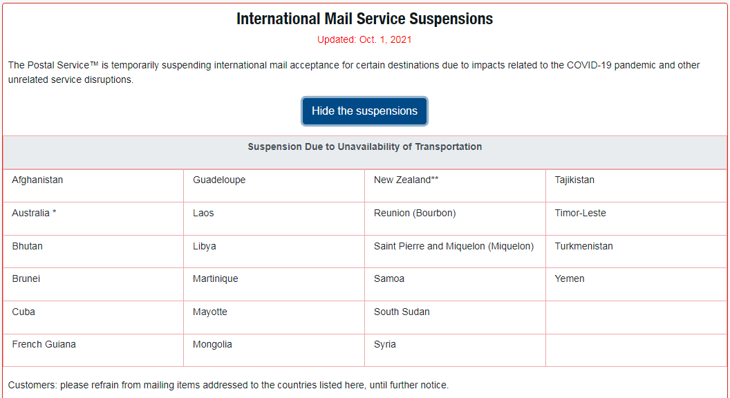 Bodhiseed Posted October 4, 2021 Posted October 4, 2021 38 minutes ago, TheThumbPuppy said: Thank you @Bodhiseed Do you have the URL from where you took that screenshot please? I see that Australia and New Zealand have further information (* and **). Here you go: https://about.usps.com/newsroom/service-alerts/international/welcome.htm (Love your avatar and name, by the way!)