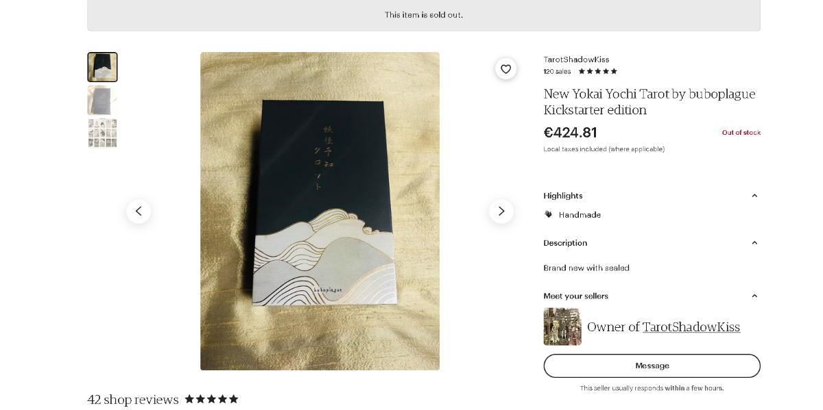 Rori Posted May 13, 2022 Posted May 13, 2022 (edited) @gregory - just a quick heads up - there are some more yokai yochi decks available on pledgemanager right now, probably due to cancelations or something - the fool pin and the cloth are also available right now. They keep coming back periodically, it seems - probably whenever an order gets canceled - so if you can get it delivered to a friend outside the UK, it might be worth checking back in once a day or so. I haven't seen them come back on Etsy, so you probably won't be able to get it shipped to the UK directly 😞 Edited May 13, 2022 by Rori