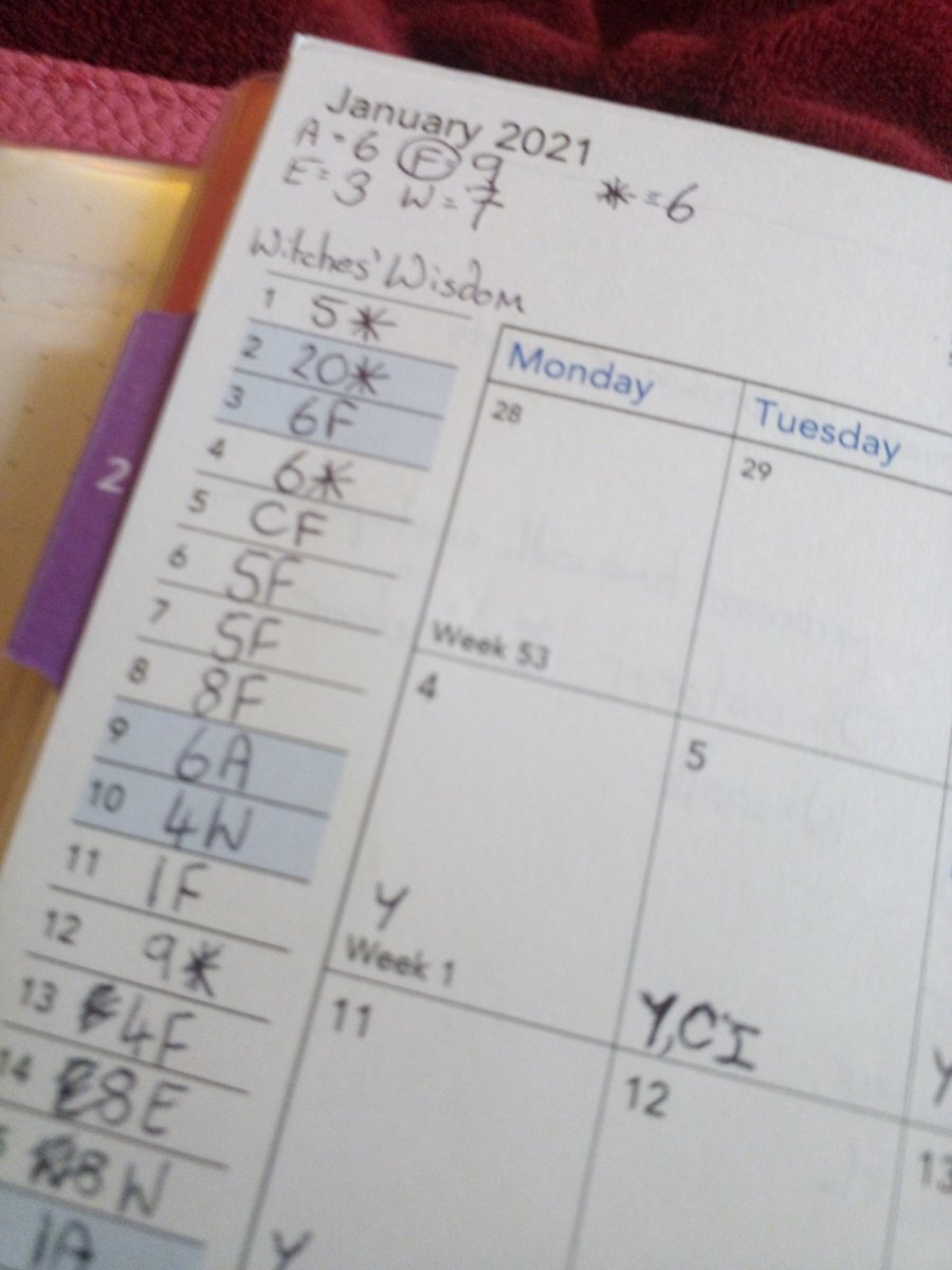stephanelli Posted November 11, 2021 Posted November 11, 2021 On 11/3/2021 at 6:48 AM, Sevenwonders said: I have read lots of advice that says to record your daily card in a journal. I appreciate that everyone's way of journalling will be different but I was wondering if you could describe or show me some of your examples to give me ideas to get me started. What kind of things do you find useful to record? Do you find you refer back to your entries at a later date? How do you lay out the information? Do you have separate sections for different information? Digital or paper? I feel like there's so many choices it's a bit overwhelming to know how to get started. I use a very a very simple journal in my Filofax (which is set up a bit like a bullet journal). I use a monthly calendar to track other things and down the side I track my daily draws. I don't tend to write about them or anything, just what the card was. The deck I'm using has a very in depth guide book so I don't feel the need to write anything. I'm planning on inputting the data into a spreadsheet to see how things went over the year in terms of cards. And which card came up most! But also look into minor/major arcana and suites and such like. Here's a picture from the start of January, sorry if it's a little blurry...