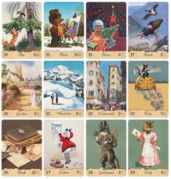 katrinka Posted December 28, 2021 Posted December 28, 2021 (edited) I do like old postcards, but this deck looks extremely problematic: The Letter looks like a Child card. The Crossroads doesn't even appear to show a crossroads, it looks more like a bad Tower card. The Garden also has some kind of tower in the background. The Fox card could just as easily be a Tree card. The Book looks like it's sitting on scattered letters. The Gentleman has a Clover, the Lady has a Letter. (And yes, the Piatnik Gent holds a letter - but that deck isn't infested with multiple issues.) The Rats are barely noticeable, what jumps out is that cat on a jack-o-lantern. The Stars - what's that kid doing there? And that clock tower? And this is just 9 cards - 1/4 of the deck. How bad are the others? How much of a headache would reading a GT with this be? Titles on Lenormand cards are a major red flag. You should be able to identify an image instantly, without a title. And using glyphs instead of insets can slow you down when you're looking for a preponderance of a certain suit. Additionally, the images don't express the card essences. The Fox doesn't look so clever or devious when there's a crow getting the better of him. That cartoon artist bear doesn't speak of accumulation, power or possessiveness. The Stars card looks like it's about Christmas. Mountains aren't really obstacles to people on ski trips, they're recreation. I'm not getting options or decisions from a Crossroads card with no crossroads. The rats aren't doing any damage, they've been pressed into service. There is no reason for the Gent to be carrying a ladder. And why are they cats? This isn't a cat deck. If you were doing some kind of cat Lenormand, wouldn't it make sense to have a cat Child? And playing card insets with cat courts? It would be wonky, but at least it would be consistent. I did google black storks, and apparently they exist, so they get a pass, sort of. But I did have to look them up. At first sight, they look like some kind of weird cranes. And there's a mountain in the background. Aesthetically, there's no consistency. The whole deck looks very obviously scavenged by someone who just wanted to throw something together and make a few bucks, without learning anything about Lenormand. I don't detect any humor or irony in it, so it doesn't even work as a wonky deck, like the Legendary. If you just love the images, get it to look at, or for an art project. This is not a reading deck, by any stretch of the imagination. Edited December 28, 2021 by katrinka
