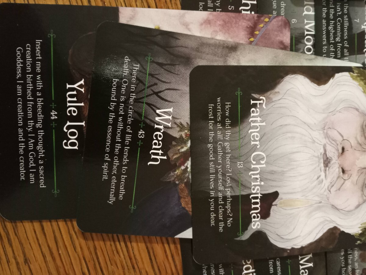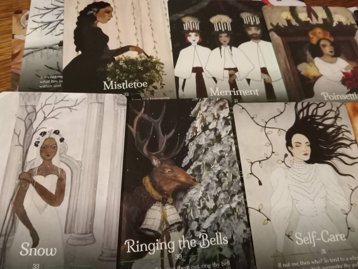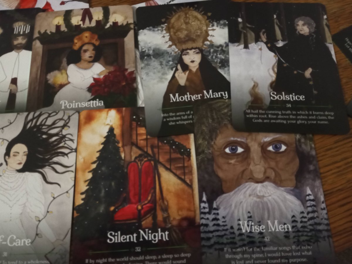 Aeona Posted December 16, 2021 Posted December 16, 2021 I don't normally indulge in "oracle decks." I understand there is a broad range of these types of decks, and some are just happy platitudes while others are food for thought, and some may be comprehensive, workable, and useful. Lately I've been watching Tarot folks on youtube, and many of them also show oracle decks. I saw this one, the Yule Oracle, and it was visually appealing to me and I thought maybe a card a day would help me get in the spirit of the winter holiday season. Even if I didn't use it for anything serious, a nice winter picture along with a thought provoking blurb to display in my living room every day? Sounds great! This deck is 44 cards full of nice multi-ethnicity people who are both young and old, there are also animals, snowy forests, cozy holiday decorated homes (everything is quite Christmas themed, despite it being Seasons of the Witch. I expected a little more paganism.) I do like the art and the scenes on the cards. My problem is with the text. The blurbs at the bottom of the cards. Most of it is straight garbage, it makes no sense. It's like someone got drunk and had to finish it in a hurry. And maybe they got paid extra for each "thy" they included because there is a LOT of THY. There is no thee, thou, thine, or any other form of thy. Thy is used incorrectly in many cases, and when it can't be made to fit, the text reverts back to plain modern "you" even within the same sentence. It's awful and I regret having this. See the pictures for some examples of the pretty pictures and terrible text