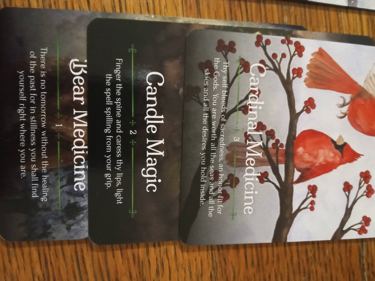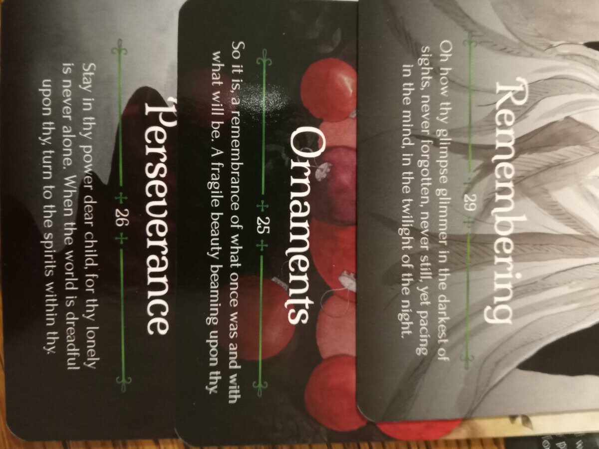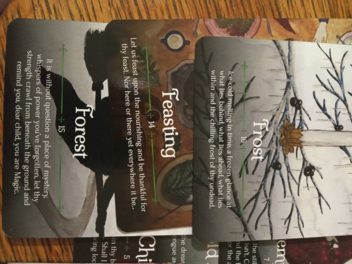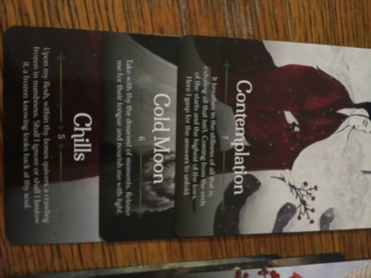 Aeona Posted December 16, 2021 Posted December 16, 2021 I don't normally indulge in "oracle decks." I understand there is a broad range of these types of decks, and some are just happy platitudes while others are food for thought, and some may be comprehensive, workable, and useful. Lately I've been watching Tarot folks on youtube, and many of them also show oracle decks. I saw this one, the Yule Oracle, and it was visually appealing to me and I thought maybe a card a day would help me get in the spirit of the winter holiday season. Even if I didn't use it for anything serious, a nice winter picture along with a thought provoking blurb to display in my living room every day? Sounds great! This deck is 44 cards full of nice multi-ethnicity people who are both young and old, there are also animals, snowy forests, cozy holiday decorated homes (everything is quite Christmas themed, despite it being Seasons of the Witch. I expected a little more paganism.) I do like the art and the scenes on the cards. My problem is with the text. The blurbs at the bottom of the cards. Most of it is straight garbage, it makes no sense. It's like someone got drunk and had to finish it in a hurry. And maybe they got paid extra for each "thy" they included because there is a LOT of THY. There is no thee, thou, thine, or any other form of thy. Thy is used incorrectly in many cases, and when it can't be made to fit, the text reverts back to plain modern "you" even within the same sentence. It's awful and I regret having this. See the pictures for some examples of the pretty pictures and terrible text