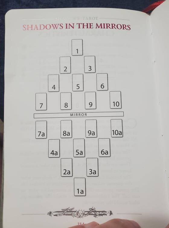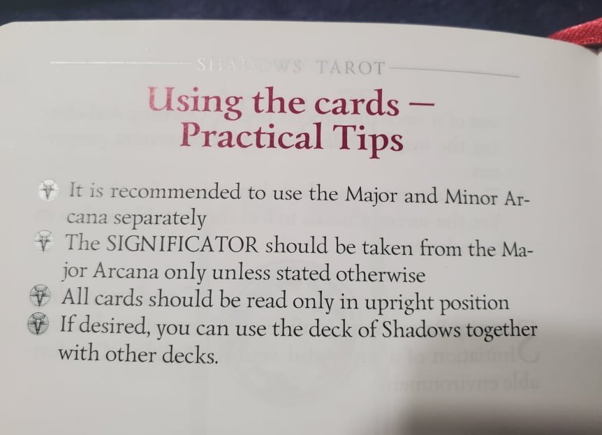 Wyrdkiss Posted January 9, 2022 Posted January 9, 2022 OK, this Shadow Tarot (which I incorrectly referred to as the Tarot of Shadows initially) is compelling and unique. I will skip the details of my personal reading. I will say I emoted and highlighted my internal fears to the letter with one card from each the Major and Minor arcana. A bit of background on the deck: Vera Sklyarova, from Russia, seems to take a theistic approach to the presence of shadow work. She is, however, attempting to dispel or shine the light on the negativity in the users life. Illuminate, and integrate. While the imagery can be disturbing, i've noted the intent is good. The one caveat is that some spreads "scan" the intent and integrity of others. I personally have no problem with that and have done so from the start of my tarot journey. This is by far the most (and only) Abrahamic style deck I work with. I have no affinity of the Christian paradigm; I find even the R-W-S deck annoying. Yet, it takes a unique approach. let me explain: It uses parable and Judeo-Christian mythology to emphasize growth opportunities, yet the book (which is excellent) does not by any means sugar coat the contradictions and abuse found within the Old and New Testament. Instead, the author utilizes the core reality of the Bible's portion to assist the querent. I will detail this with the Minor Arcana "Job" (the biblical person) in card form later. The major and Minor arcana are drawn separately in the deck. In some spreads she provides, The Majors serve only as the Significator. That is a reading style I don't normally use, but regarding this pack Significators work well. They are chosen by the reader, after hearing out (or pondering if solo) the situation. A pic of other guidelines for the reading approach is included here. and lastly, enclosed is a pretty cool spread which uses two decks -- the Shadows Tarot and another of your choosing, preferably a tarot not an oracle. The bottom of the triangle is where the shadows reside, and that deck's cards are placed there. I am loving this ride, although at times it can be a bit unsettling to read with. Not the imagery, but the honesty and accuracy. In my next post, I will dive into the cards XII EXORCISM and PEONIES (the flowers). feedback and questions welcomed.