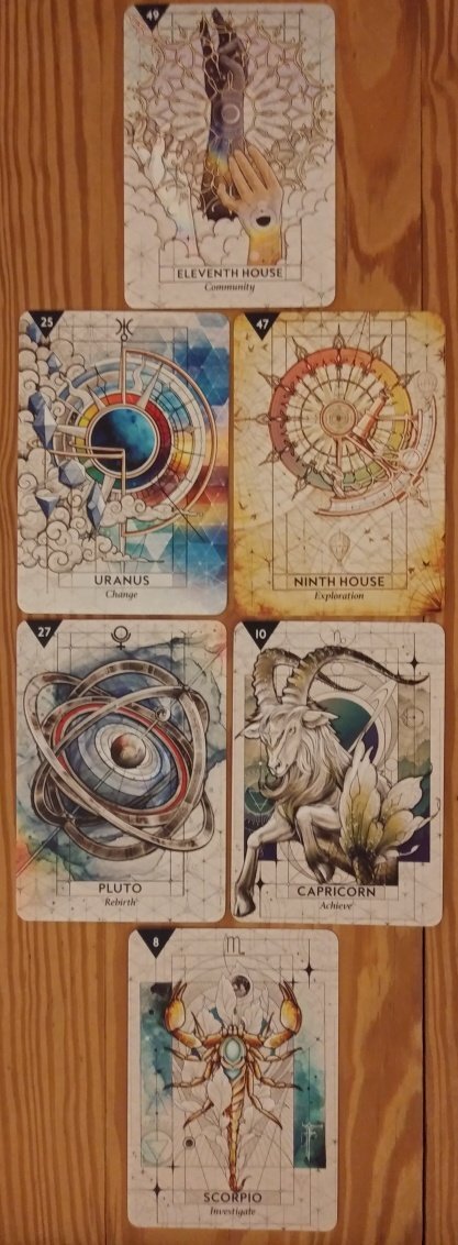 Rachelcat Posted January 8, 2022 Posted January 8, 2022 I’ll be using another new acquisition this week, Starcodes Astro Oracle from Hay House. It’s a pretty normal astro oracle, with signs, planets, and houses. It also includes the moon nodes, some asteroids, the angles (incorrectly called “cardinal points”), a few aspects, and, interestingly, “Transits” and “Progressions,” for a total of 56 cards. I recently got Heavenly Bodies Astrology, another astro oracle, which I quite like, but it’s very ethereal and so doesn’t pair well with my favorite tarot decks (when I use the house cards for spread cards). Starcodes is the perfect antithesis. Self-described as “boldly illustrated,” it has a steampunk meets sacred? geometry vibe. The artist is Lucas Lua de Souza, a tattoo artist. The author is Heather Roan Robbins, who publishes an astrology column called “Starcodes.” I’ve already pulled out the houses to use as spread cards, but then I put everything back in order. So time for a serious wash and shuffle, then on to the interview. Most important characteristic: Scorpio, Investigate The deck is a tool for investigating mysterious things. It can be surprisingly deep, considering I think I know enough about astrology at least for using astrology cards! We’ll see if that’s true! Strength: Capricorn, Achieve The deck is the result of an effort to achieve something really good. Not a hack job. It wants to be the top of its field. Weakness: Pluto, Rebirth Pluto is a ruler of Scorpio and shares its concept of depth. So maybe the deck is a perfectly good oracle, but not as deep as it wants to be? What can I learn? Ninth House, Exploration But there’s still a lot of astrological info I can learn! The deck will encourage me to expand my astro studies. How do I learn it? Uranus, Change I can buy into that by learning new things and maybe changing my mind on some concepts I think I already know. Outcome of our work together: Eleventh House, Community The deck and I will become good friends. And maybe using it will put me in contact with some more astrologically minded friends! Well, that wasn’t an easy read. We’ll see how I do the rest of the week!