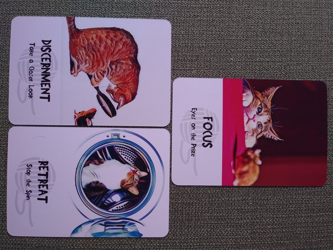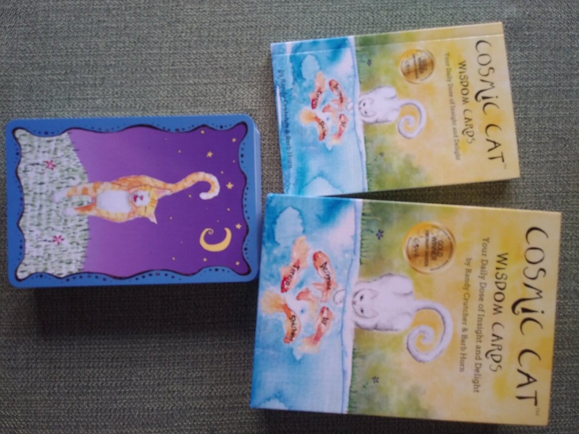 Rachelcat Posted February 6, 2022 Posted February 6, 2022 Hi, everyone! Late to the party, but I’m really here! I’m taking it easy with readings this week, both because this fun oracle is up in the rotation as one of my newer decks and because I’m falling down the angel and demon shemhamephorash rabbit hole again, which basically means I’m smashing together info from many books and decks into one table to rule them. But I digress. This week’s deck is Cosmic Cat Wisdom Cards: Your Daily does of Insight and Delight by Randy Crutcher and Barb Horn. (They also have Divine Dog Wisdom Cards.) 60 large (5.5 x 3.75 inches), glossy cards with a same size book. Book has about a page of info and “Other Thoughts to Stalk” (questions and prompts for introspection) for each card. The art looks like digitally altered photos. So you get all that real catness with added whimsy and color. It has large keywords and advice over a greyed out ball of yarn. (I got this as a replacement for Cat Wisdom by Blue Angel, which is all photos of kittens in a studio. I like to see all cats, not just cute kittens, and the staging of the poor little things seemed exploitive somehow . . .) Wash and shuffle and a brief interview: The deck’s strength: Retreat, Stop the Spin It’s actually good at triggering some introspection, and will give me something different to think about. The deck’s weakness: Discernment, Take a Closer Look But I shouldn’t expect it to be TOO deep. It’s cute pictures of cats with keywords! Outcome of our work together: Focus, Eyes on the Prize It will help me zoom in on some issues I’m not aware of right now. It will help me refine my understanding of what my goals are. Ok, I’m liking these cheeky kitties so far, even if they seem to be obsessed with mice. (NOT my favorite animals, but I didn’t like having to kill them . . . Thankfully, they’ve been gone from my kitchen for a while now!) I’ll probably just do a card of the day every day this week over in my journal. See you there!