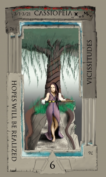 Guest Posted May 18, 2018 Posted May 18, 2018 It's hard to pick one thing - that's just it - there's a LOT there ! Ignore me and wait to see who agrees with whom ! No-one ever likes everything about any deck ;) For ONE thing - maybe a single column instead of four ? but as I say - we all have our own views. each border will become a part of the image in a way that will become more apparent as I progress... ironically i have yet to make a border that goes with it's card..I really just paint what my studies bring me to contemplate or time dictates. The borders are elaborate,I think fussy implies "ornate for no reason" or "making much a do about nothing," there is nothing on the border that does not correspond to the card. in the end even the small shadows will have s specific reason for being there. There is more information to put into each card's border that I have not juggled around yet as well. In the end depending on the minor or court card the border will tell you about the cards correspondence with: sign - best and worst qualities house planet - best and worst qualities quality triplicity emanationnumerological meaningastrological meaning here is 9 of water. I only have about 30 cards left to lay out. Then i can just take it easy and have fun coloring pictures, and see if I am feeling like hand painting every word... the tale of Cassiopeia is so old and yet so familiar. Her vain words will spell the doom of her daughter and her people. Cassiopeia is typically shown holding a branch reclining in a chair, here we have Cassioppeie blocking the way to the tree of life which was hidden here opposite the tree of knowledge that is in the sign of Virgo in the Garden of Eden. She offers the king's scepter all desires of life and power, that we may be distracted from renewal of life offered behind her if we can surmount these distractions
