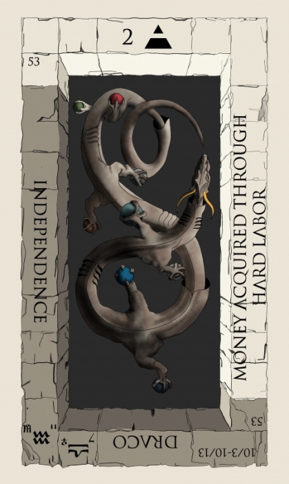 Guest Posted August 7, 2018 Posted August 7, 2018 welp it has been forever and a day it seems since I have shown my progress..... I have about twenty cards left that are not all fleshed out with solid designs. Someone at work asked me to draw them a dragon tattoo :o so i allowed her to choose a card rather than wasting a bunch of time designing her something new. This was fun I drew a dragon a day for a week allowing her to peak at each day until i had it. this is Draco the second decanate of Libra the marriage sign. I have drawn this serpent more akin to the modern view of Draco and the evil beast of the book of revelations that falls to earth, the dragon St. George slew, the dragon Lord Krishna destroys. A long snake like serpent that may very likely represent some historic accounts of cosmic events. This spiraling snake wraps itself around the pole star almost always rising as it sets, but the stories typically allegorically warn of the dangers of marriage and unions for false reasons. The original Draco was a much larger image, with wings, that was centered upon the pole star and would have taken up the entire northern sky. It would have appeared as a huge winged dragon spinning over head. This dragon did not have a the negative canotations the newer would have, but they surprisingly appear to have expressed the same concepts. Of a healthy union and watchfulness of ones desires and actions and the effects those things have on others. draco reminds us to retain our independence no matter the relationship. independence is created by work and effort on our own part, with out those key ingredients we are going to find ourselves reliant.