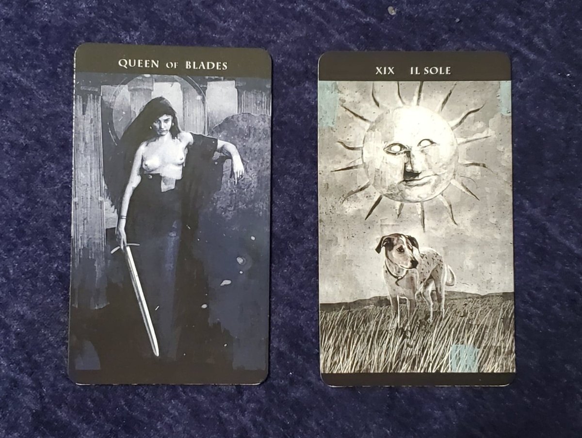 Wyrdkiss Posted March 7, 2022 Posted March 7, 2022 (edited) 4 hours ago, sweeneyish said: Thanks @Wyrdkiss, it is really reassuring and validating to read your view here! And I totally agree re: the story book vibe. The circular spread is really great for showing the interactions between all the characters as well. Glad I shared then @sweeneyish! Conducted my first reading of the week with my Darkness of Light tarot. My question centered around a visit up North I have planned. I am pressed for time with life matters, but I want to see this friend. The spread was simply, "What if I cancel (left) and what if I make the journey (right). If I postpone -- Queen of Swords. This confident woman makes the decisions that are best for her, and when engaged in this mode of personality this is the look she gives to anyone who criticizes. The ultimate in practicality, she says, "your true friends will wait. Take care of your business." The Sun was so illuminating, however, in the context of this question. No pun intended. I feel as if a brief visit can be managed if prioritized, and it is long overdue. There is also the potential for some healing and reflection on the way and back as well. I've decided to make it happen. This is the first pressing of this deck. Wildly popular, it is now in its fourth printing. Edited March 7, 2022 by Wyrdkiss