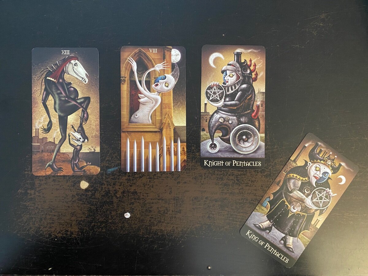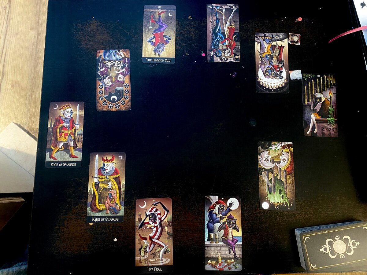 sweeneyish Posted March 5, 2022 Posted March 5, 2022 @Wyrdkiss Pretty beautiful borderless, eh? The cards are thinner than the bordered ones but I actually quite like the feeling of them. The first time I shuffled them I had that “Oh, this deck is a good one for me” feeling. I’m quite inspired to dive deep on this one. A few more decks of Patrick’s will be coming through the mail to me in the next weeks, so I’m sure I’ll get distracted and play with them, but I’m quite dedicated to getting know this deck! I did the Lunatic Spread for the LWB this morning. I don’t usually use reversals, but in an attempt to try to honour all the work he put into the card meanings, I incorporated them here. As always, I found the reversals added a bit of a negative tone to the spread, but a lot of it also felt pretty accurate.