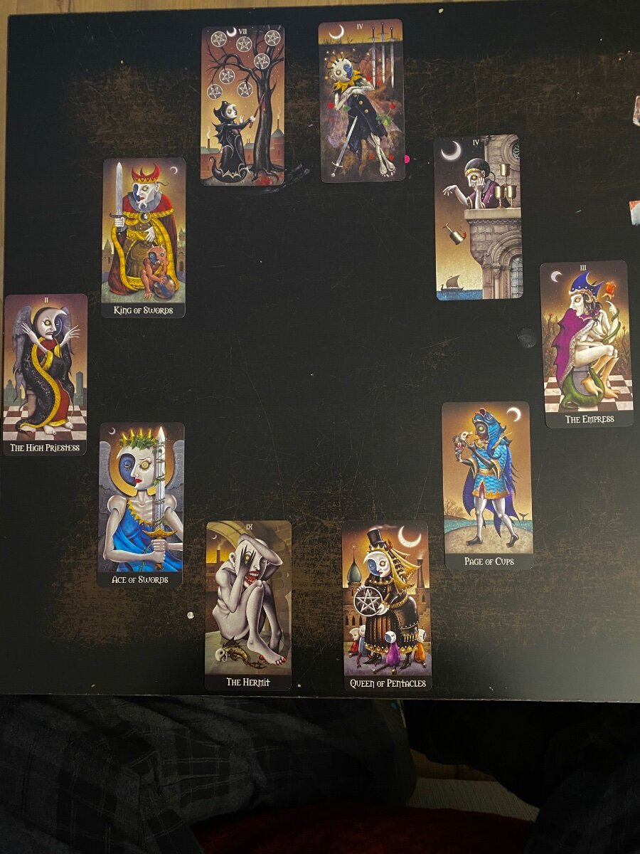 sweeneyish Posted March 6, 2022 Posted March 6, 2022 I decided to redo my lunatic spread from yesterday without reversals, since they always seem to block the flow of the reading for me. Instead I considered both sets of meanings for each card based on the context. So much better! The cards really lend themselves to storytelling.