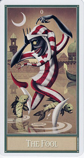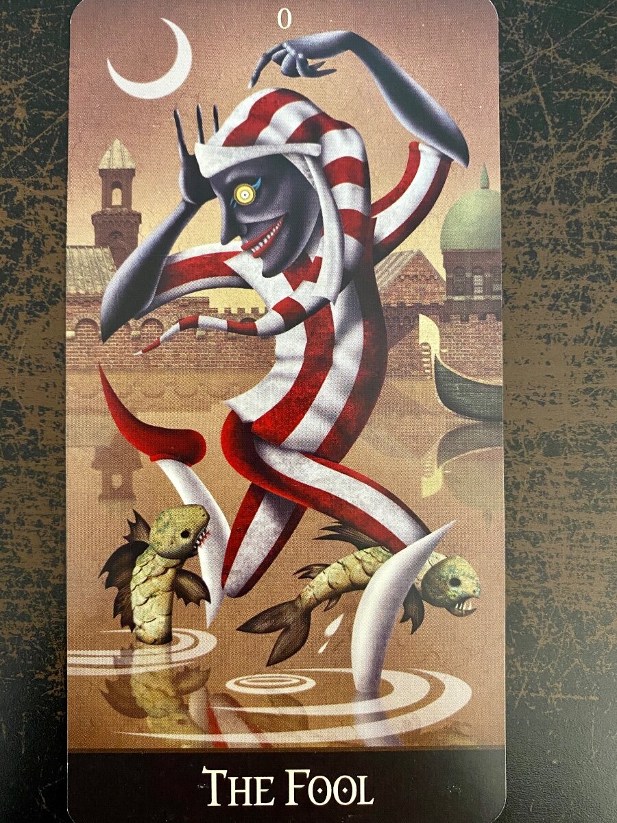 sweeneyish Posted March 19, 2022 Posted March 19, 2022 (edited) 0. The Fool With the Fool’s first tilted step into the canal water of the subconscious, we begin our journey into the world of the Deviant Moon. This Fool is wearing his pyjamas, apparently stumbling madly from bed right into his spontaneous adventure. His grin and eyes have a decidedly maniacal cast. His one finger points loosely to his head. Perhaps this signifies the power of dreams, madness, or the mind. A vicious looking fish bites his ankle, but the Fool doesn’t appear to care. Does the pain of the bite draw him back to reality and the earth, or is he so lost in spontaneous madness that he doesn’t notice? A boat floats in the background, perhaps to help bring the Fool to his next destination (although it is hard to imagine the Fool stopping long enough to sit still in a boat). The moon is in the first lunar phase, perhaps signalling that the Fool’s journey is just beginning. Interestingly, as wild and mad as the Fool is, the moon does not appear to have a strong influence on his lunacy (not yet, anyways). That will come later. Keywords: Inspiration, fearlessness, madness, lunacy, beginnings, spontaneity, mania, joy, wildness I really like this Fool. He has a bit of an edge to him, like many of the characters in this world. While the traditional Fool has very a harmless, innocent feeling about them, this Fool’s wildness makes him seem a little scary and unpredictable. Some questions to ponder that I’ve been brainstorming: Where did this Fool come from? What happened before this scene? And where is he headed next? Does the Major Arcana follow a Fool’s Journey like many interpret the Rider Waite Smith to, or are these individual characters that represent different aspects of the human condition? To me, I think it’s very much the second, but I’m curious to hear what everyone else thinks. I feel inspired to make a spread based on this Fool - I’ll post it here once it’s complete! Very interested to hear everyone’s thoughts on this maniacal fellow. Edited March 19, 2022 by sweeneyish replaced image (my own card!)