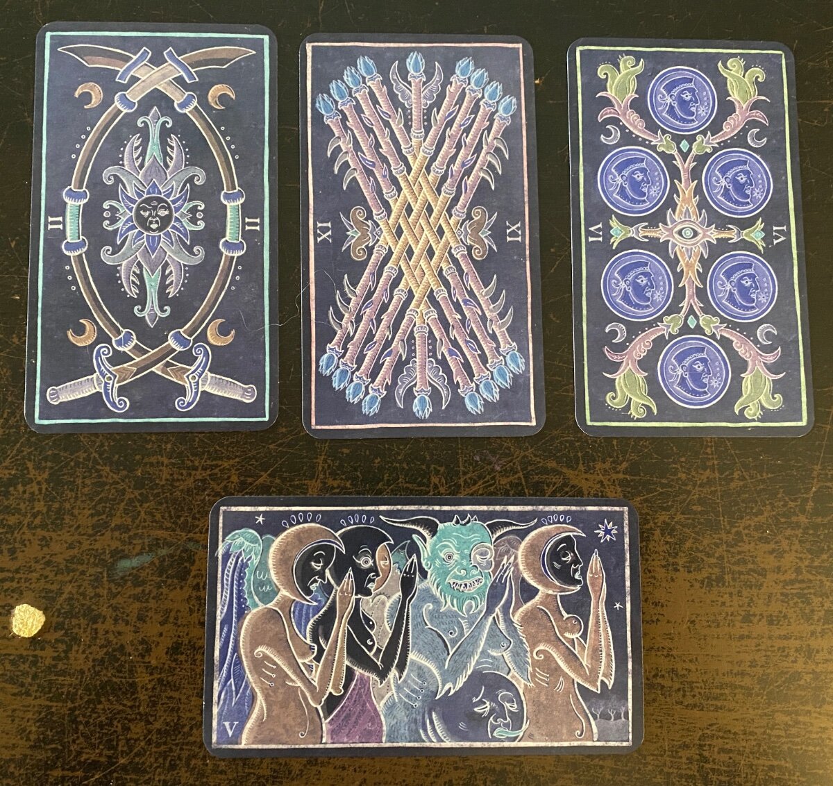 sweeneyish Posted April 4, 2022 Posted April 4, 2022 (edited) My draw with the Trionfi Della Luna today: V Bacchus: This very fun (and basically opposite) substitute for the Hierophant, which is an option in this deck. He represents what you would imagine - abundance, desire, giving of goodwill and joy freely, indulgence. Overall, a fairly positive card to embody on a Monday! VI of Coins: I always think of this card as generosity, and in this reading, that seems to work. The green leaves on the pip expand and grow towards the cards on either side. It reinforces the giving nature of Bacchus. So it's a day to give joy and happiness. I just realized this also came up in my reading a couple days ago - and Bacchus in a different reading. I feel like this deck is trying to send me a strong message! II of Swords: This card is stalking me lately - it's been frequently appearing in my readings. The side of the blade blocks the vegetation on the VI of Coins, and unlike Bacchus and the VI of Coins, the card is physically closed. Inside the card, the sun/moon/flower face actually mirrors the expression on Bacchus' face. Both Bacchus and the portraits on the coins are looking towards the II of Swords. Perhaps expressing generosity and joy will help open me up where I'm feeling blocked, and resolve this card so it can stop following me around! Edited April 4, 2022 by sweeneyish