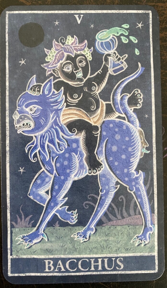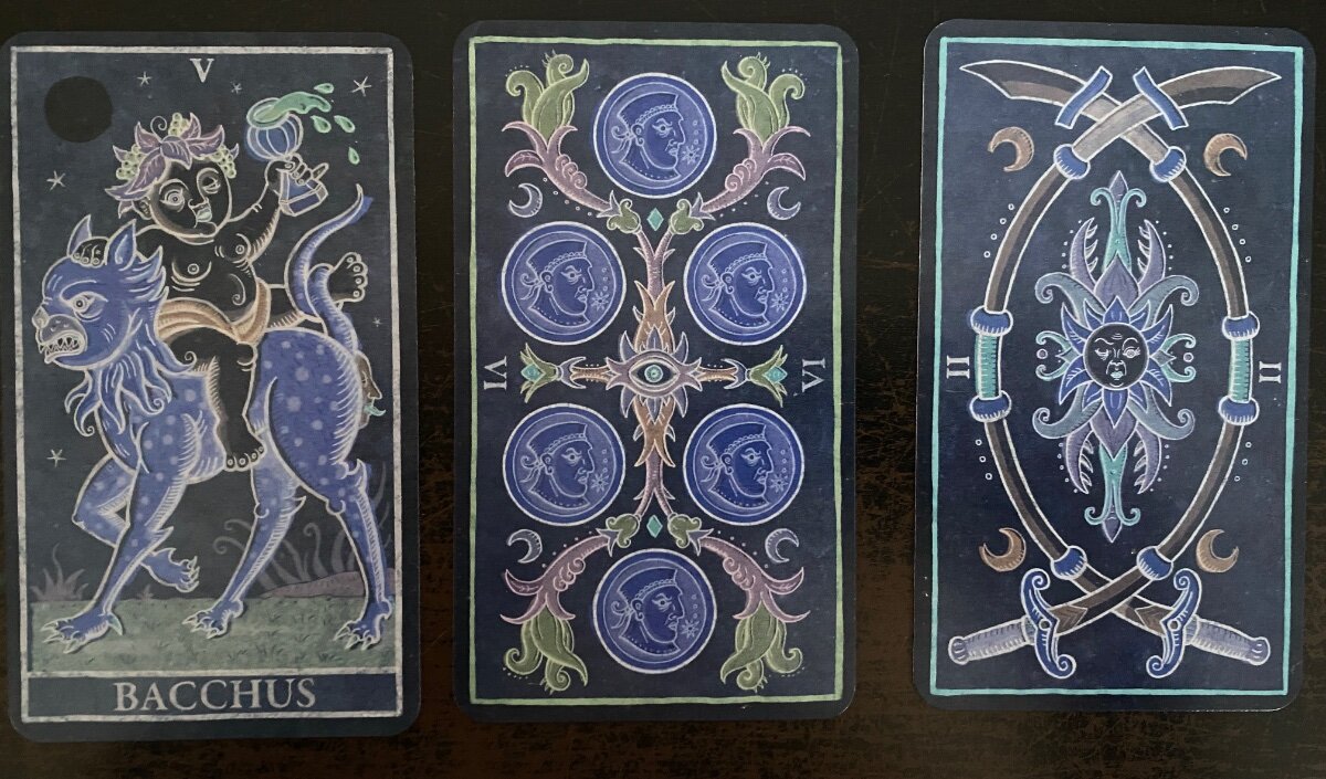 Wyrdkiss Posted April 5, 2022 Posted April 5, 2022 23 hours ago, sweeneyish said: My draw with the Trionfi Della Luna today: V Bacchus: This very fun (and basically opposite) substitute for the Hierophant, which is an option in this deck. He represents what you would imagine - abundance, desire, giving of goodwill and joy freely, indulgence. Overall, a fairly positive card to embody on a Monday! VI of Coins: I always think of this card as generosity, and in this reading, that seems to work. The green leaves on the pip expand and grow towards the cards on either side. It reinforces the giving nature of Bacchus. So it's a day to give joy and happiness. I just realized this also came up in my reading a couple days ago - and Bacchus in a different reading. I feel like this deck is trying to send me a strong message! II of Swords: This card is stalking me lately - it's been frequently appearing in my readings. The side of the blade blocks the vegetation on the VI of Coins, and unlike Bacchus and the VI of Coins, the card is physically closed. Inside the card, the sun/moon/flower face actually mirrors the expression on Bacchus' face. Both Bacchus and the portraits on the coins are looking towards the II of Swords. Perhaps expressing generosity and joy will help open me up where I'm feeling blocked, and resolve this card so it can stop following me around! That Bacchus is amazing! Very cool this pack is sending some repeated messages.