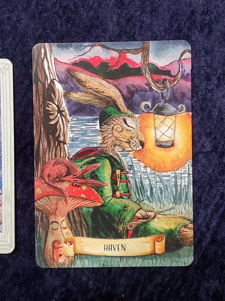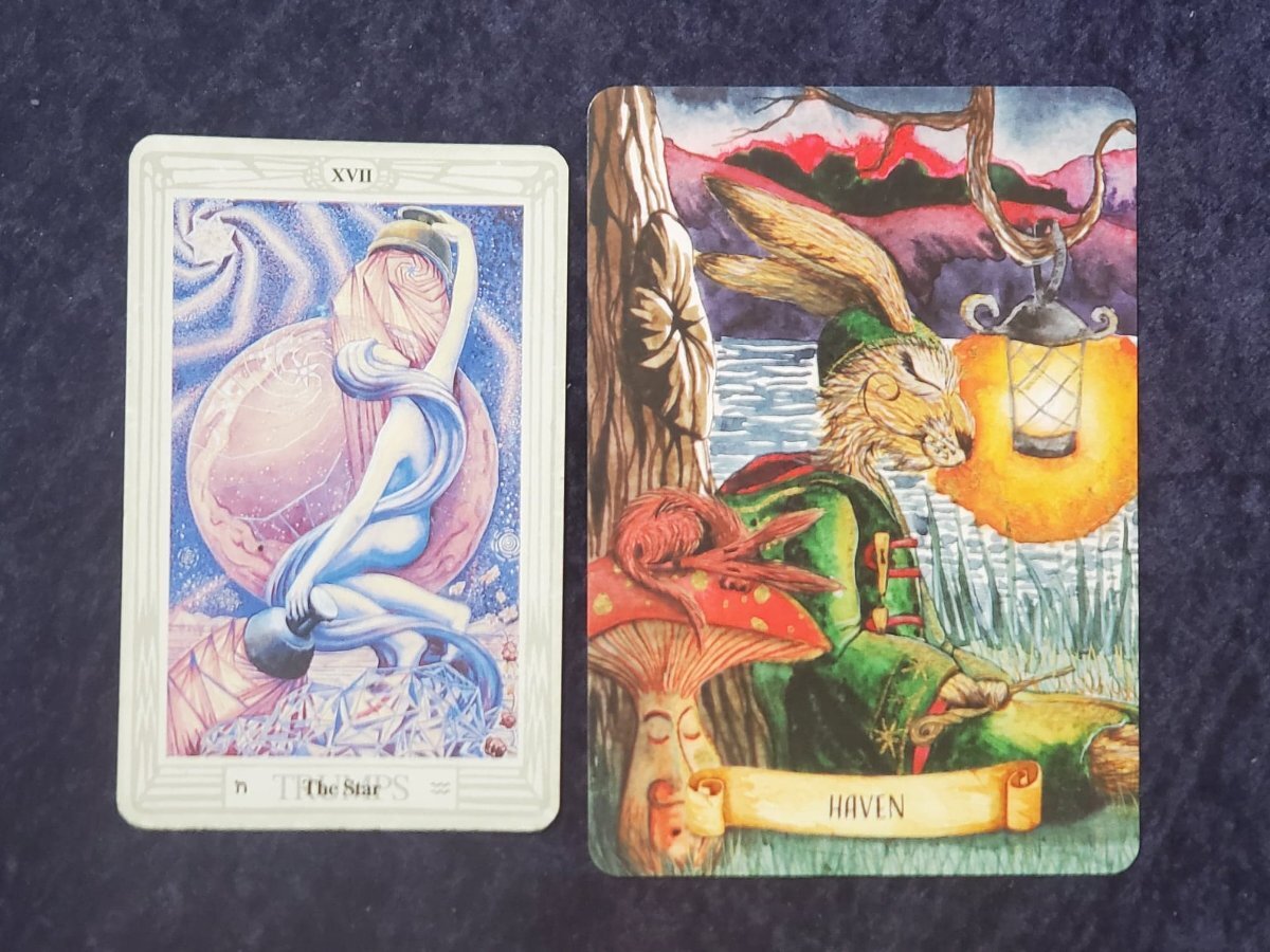 Wyrdkiss Posted April 7, 2022 Posted April 7, 2022 @sweeneyish what book are you using for your Marseille style readings? I am intrigued, for example, about how the 10 of Swords differs from RWS in that system. I enjoyed your observant assessment. I was in need of a comforting, reassuring reading this morning, and received HAVEN from the Arboridium Oracle. I'll post an actual quote from the book tomorrow, but it is essentially about finding an internal space you we can retreat to at any time we need solace and comfort. It's such a cool little card. And an important message. Oddly enough, I also drew a Thoth pull and received the Star. That is pictured in the shot here together, taken unfortunately with a rather dirty phone camera lens. I hope all of you are well tonight and keep the posts coming.