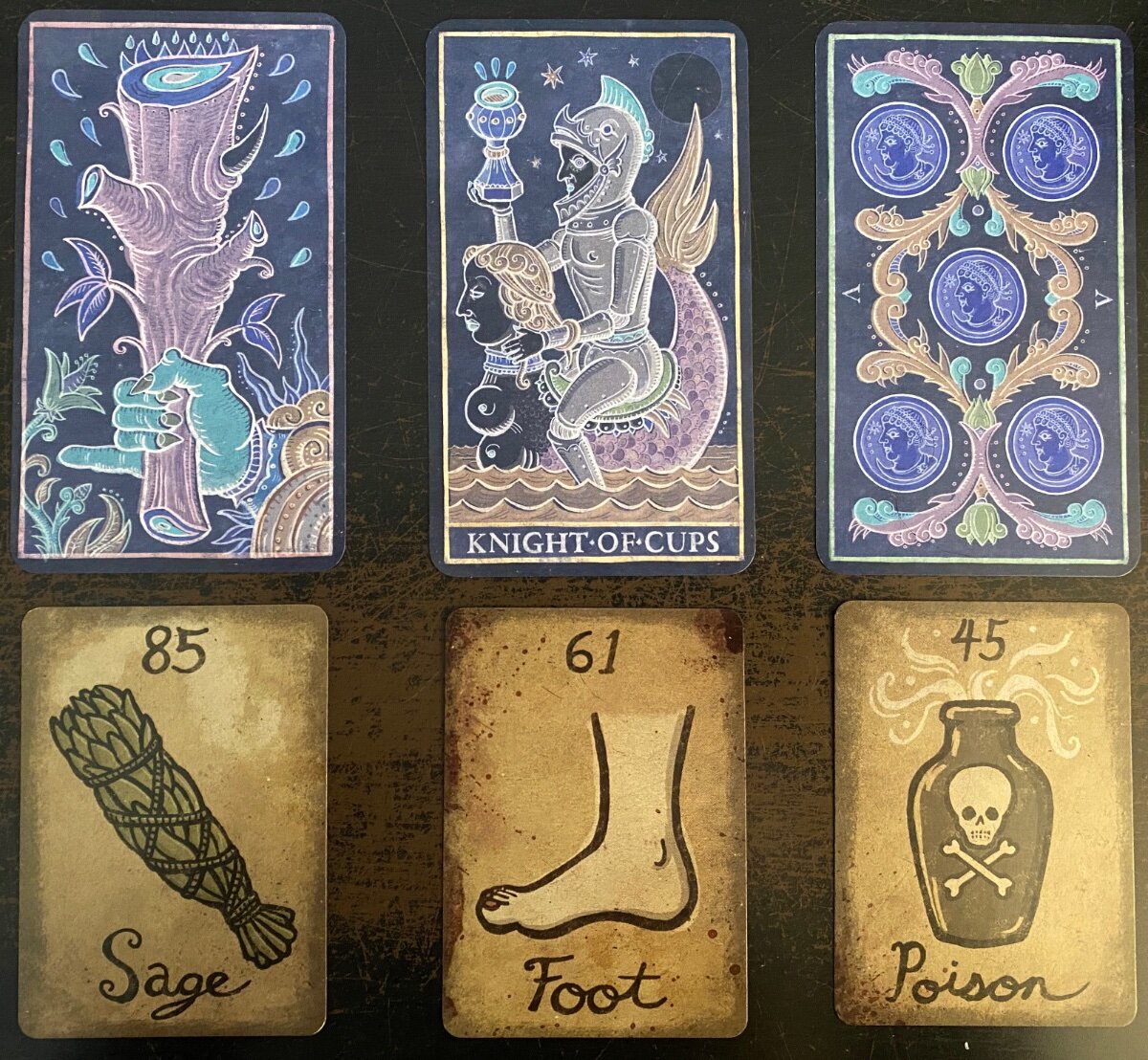 sweeneyish Posted April 5, 2022 Posted April 5, 2022 3 minutes ago, Wyrdkiss said: That Bacchus is amazing! Very cool this pack is sending some repeated messages. He's pretty cool, eh? He's riding a leopard! My reading for today - I also drew three cards from Mildred's Secret Oracle. I was actually hesitant too, because the Trinofi reading was quite good and clear, but for fun's sake (and show and tell) I did it, and interestingly, the cards lined up perfectly. As a side note, I also changed my drawing style a bit for fun. Usually I shuffle, cut the deck, and draw from the top. Today I shuffled, cut the deck, then spread the cards face down and picked three cards. It was fun. The Knight of Cups is riding away from the V of Coins, which I see as financial considerations and hardship and material concerns, and towards the Ace of Wands, which is the creative spark, intuition, imagination, spontaneous presence - all that good stuff. So with the courage of the Knight of Cups, I need to step away from financial and material concerns today, and enjoy the spark of my imagination and intuition. Supported by Sage, which represents healing and purification (enabled by the Ace of Wands), the Foot (Knight of Cups), represents the stability of moving towards healing, and away from the Poison (V of Coins).
